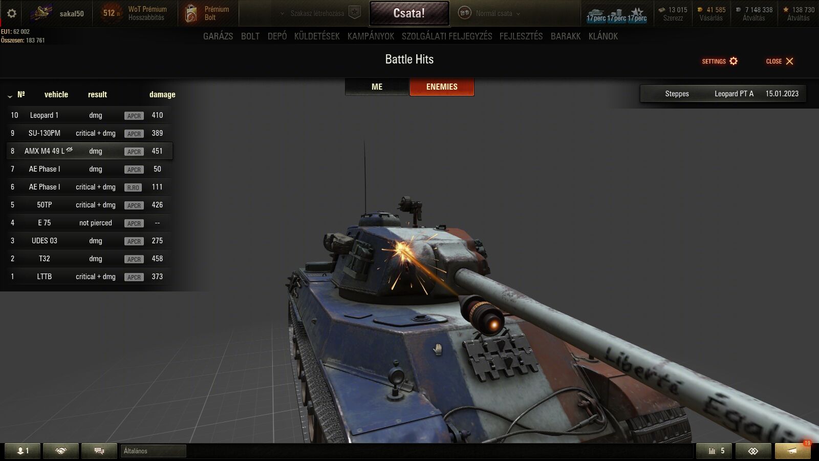 A közép és hosszú távú károk a játékmenetre kevéssé izgatják a wg-t, láthatóan.jano_77: 0,46-os alap pontosság mellett ilyen lövéseket kéne leadnod 2/3 vagy inkább 4/5, ehelyett fordított az arány. tényleg ha van rá lehetőséged próbáld ki valamelyik is klónt a tier7-ben, azoknak van még hasonló 0.46-os pontossága és a hajad fogod tépni, amikor közvetlen közelről mellé lő, ott ez rendszeres élmény