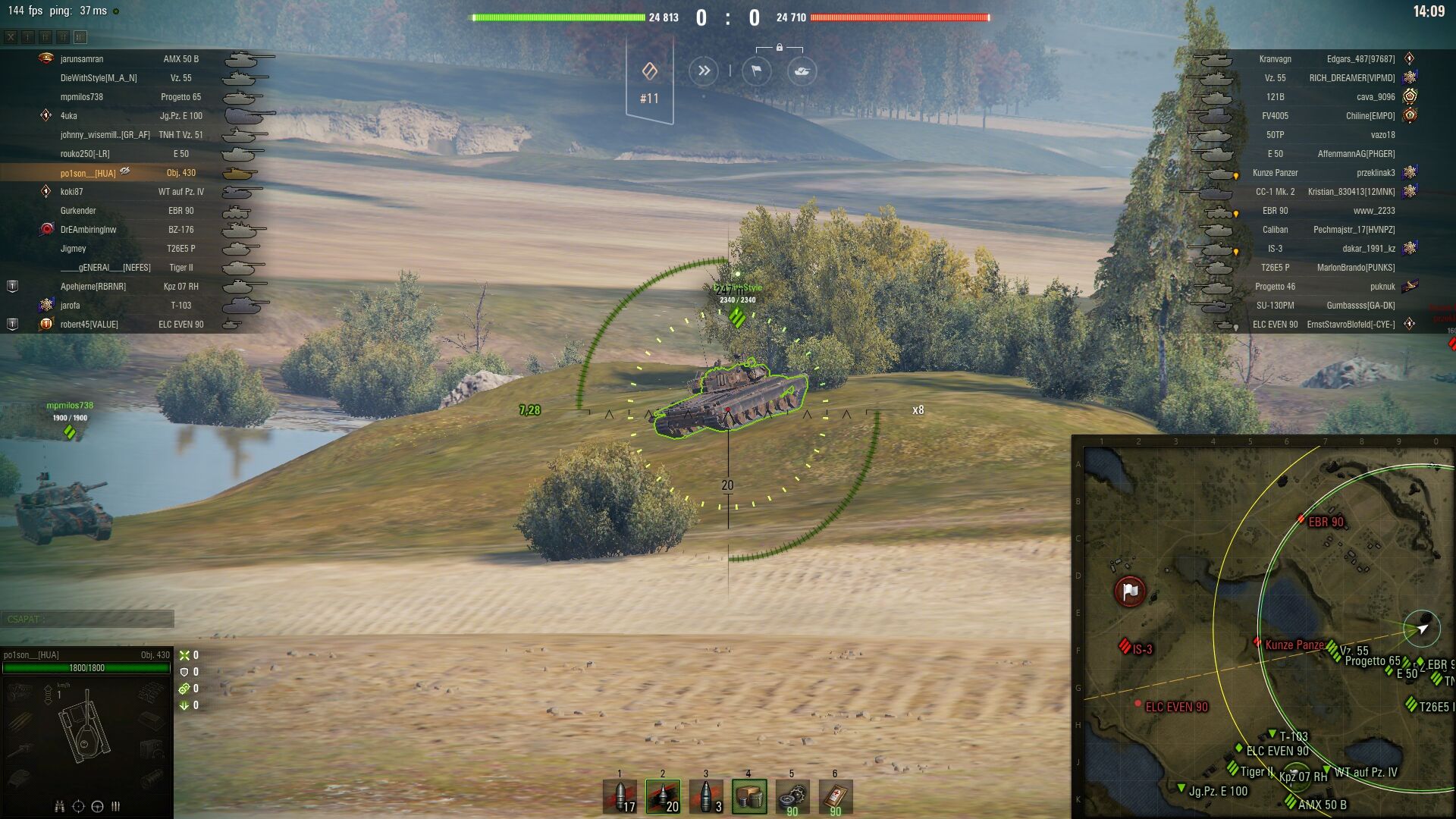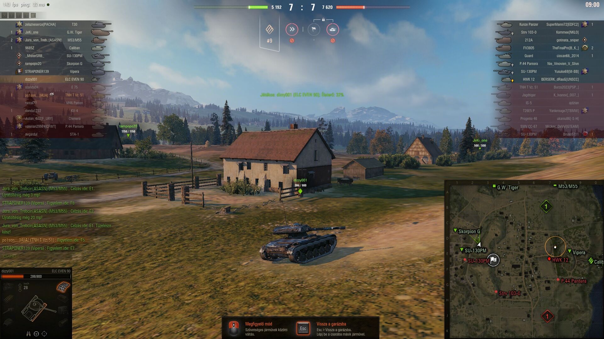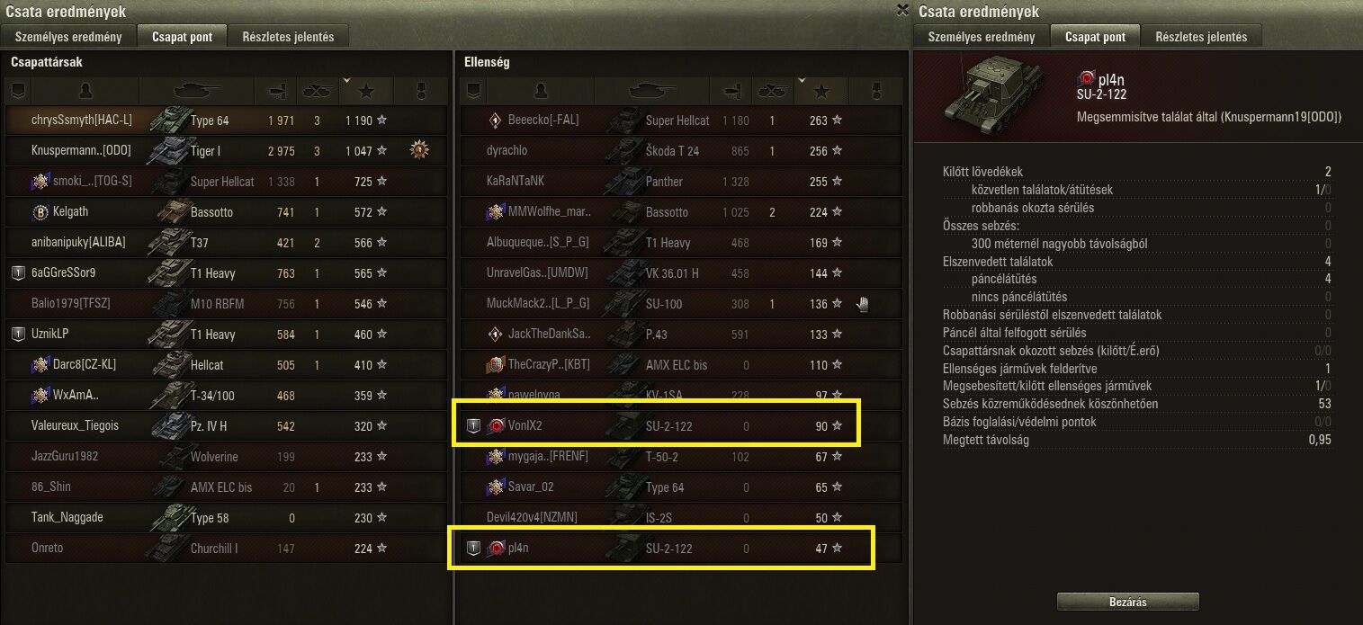 Aztán volt egy olyan meccsem Mannerheim Line-on, hogy heroikus küzdelemben sikerült megállítani az ellenfél előretörését. Maradtam én a BZ-166-tal olyan 1100 körüli hp-val egy full hp-s elc és egy afk T95. Az ellenfélnél meg egy 300hp-s JPZE100. Gondoltam egy lövés bevehetek tőle. Meg is történt, maradt vagy 100hp-m szóval kétszer rá tudtam lőni. Golddal se vitte be, mert nem oda ment a lövés, ahova céloztam. Olyan helyen volt akkor még, hogy nem tudtam volna megkerülni. De gondoltam semmi gond, kijött a nyílt terepre, az elc belelőtt egyet (de gondolom töltenie kellett). Annyi dolga lett volna, hogy ott marad mögötte. Még szerintem előtte is simán átmehetett volna, mert annyira nem tud lefelé lőni a jpz. Volt még egy perc a csatából, szóval simán újra tudott tölteni. Ehhez képest elfutott az idiótája. A jpz lekerült spotról, és amikor meg visszatért az elc, akkor a td-nek hűlt helye volt. Lejárt az idő és döntetlen lett. Pedig egy csomó xp-t kaptam volna, mert napi első győztes csata lehetett volna 3k feletti sebzéssel. A jpz elég ügyes volt, mert nagyon jól mozgatta a tankját, hogy elég hülye szögeket kaphassak, hogy esély legyen hibázásra. Mondjuk ha oda megy a lövés, ahova céloztam, akkor simán meghalt volna.