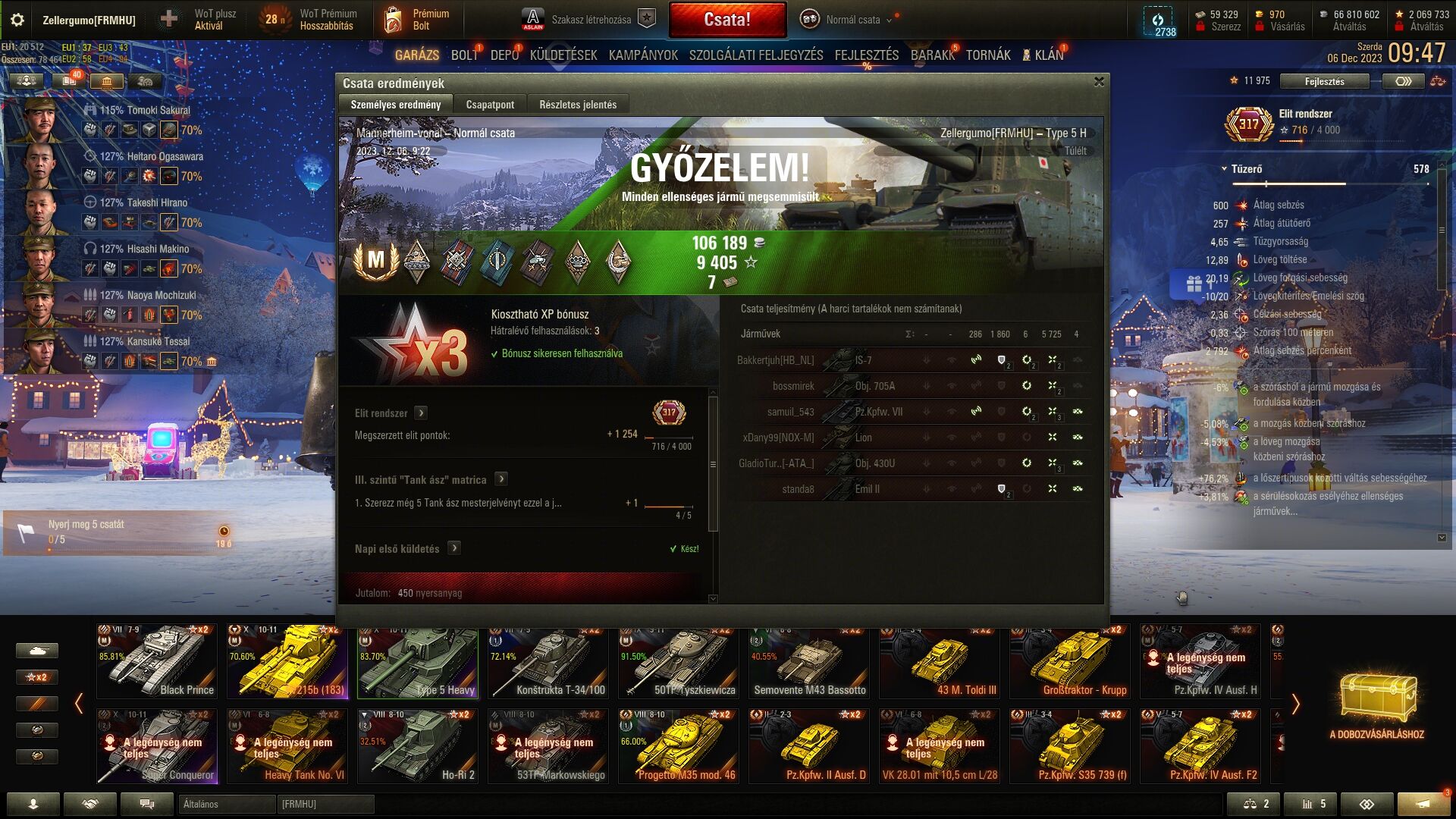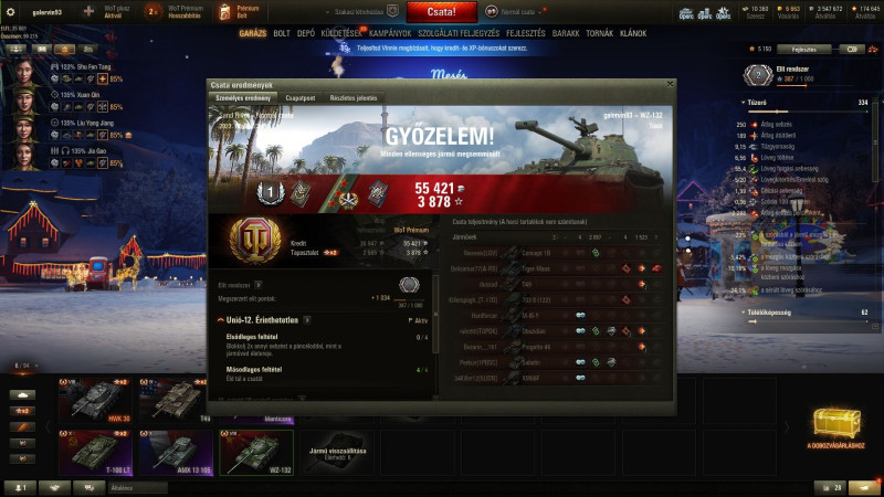 Ma megint kegyes volt a játék, indítottam egy óra kredit boostert. Az egy óra alatt lejátszottam 10 csatát (nem vicc) úgy hogy csak egy tankkal játszottam. Tehát vagy utolsóként lőttek ki vagy megvártam míg kijön a csatából és így is belefért 10 csata az 1 órába.