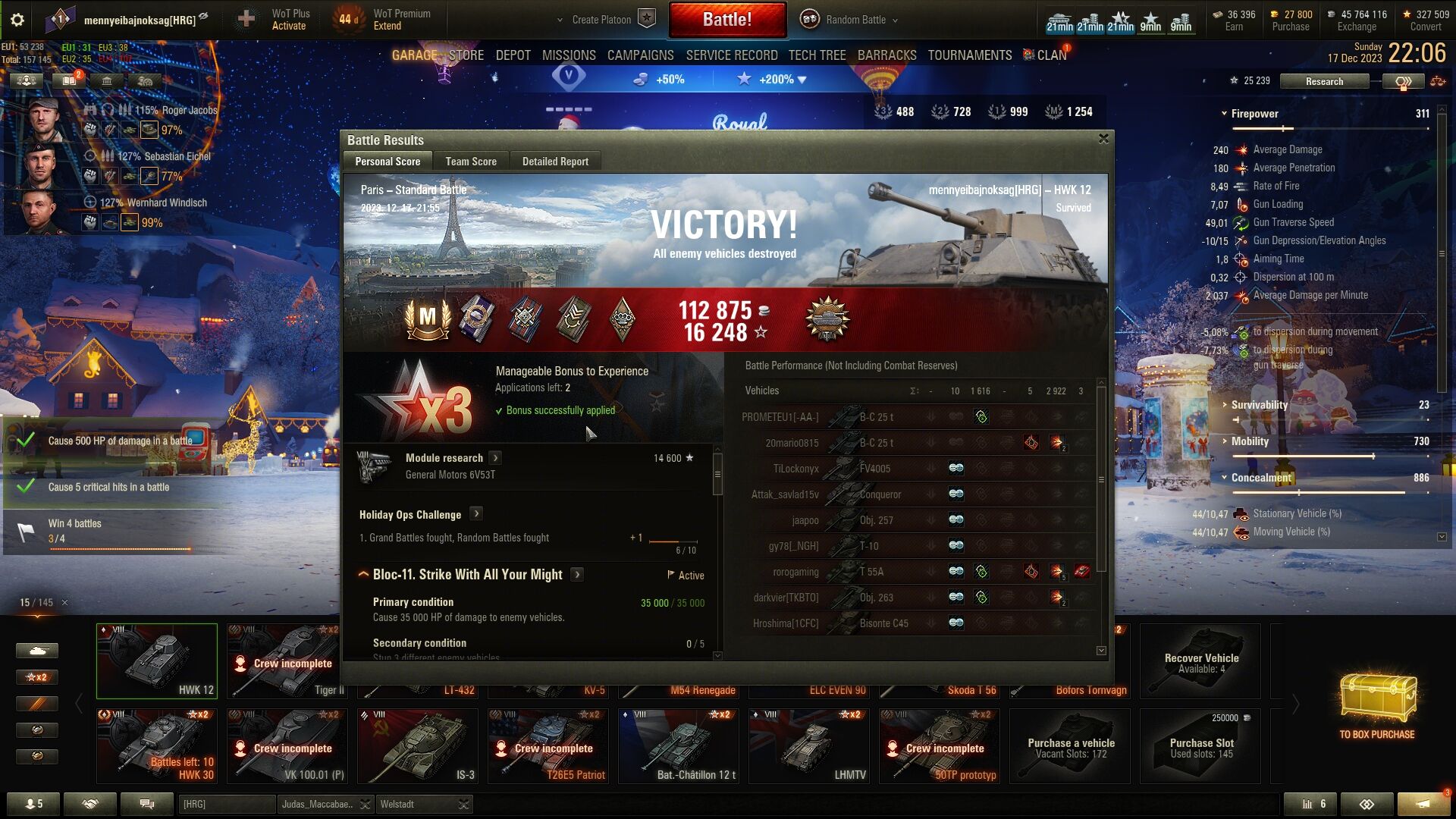 Még vasárnap Párizs pályán a HWK 12-vel egész jó kezdés után az internetem trollkodott velem, ledobott a játék és kellett 1-2 perc mire vissza tudtam lépni a csatába. Meglepő módon még életben voltam, nagyon szoros lett a csata és sikerült lehozni. A T-55A egészen biztosan bot volt, lövésre felébredt, de aztán mégsem volt képes utánam jönni, inkább elpusztult