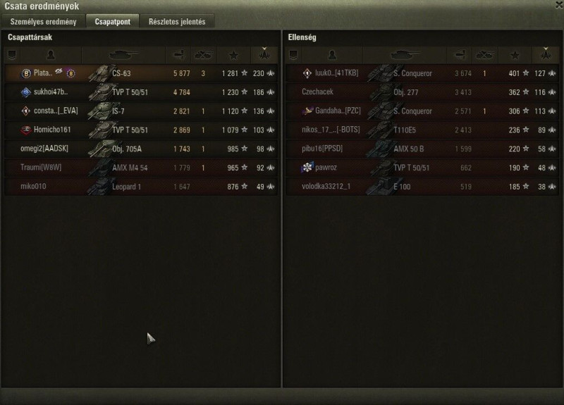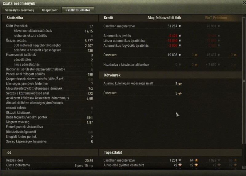 Győzelem! Csata: Redshire Járművek: CS-63 Szerzett tapasztalat: 2 562 (x2 minden nap az első csatáért) Kapott Battle Pass pontok: 100 Megszerzett kötvények: 105 Értékelési pontok: +45 Szerzett kredit: 51 267 Küldetés teljesítve! Jutalom: WoT Prémium fiók nap hozzáadva: 2 Hozzáadva: Nagyméretű elsősegély készlet (x2), Leszerelő készlet (3x)