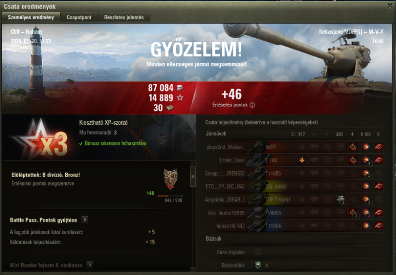 Köszi mindenkinek, átadom a gratulációkat a csapatnak, mert mindenféle álszerénység nélkül, ez inkább rajtuk múlt, könnyű dolgom volt. Nagy pacsi a T95-nek, hogy padlógázzal pusholt. Miatta indultam meg, mert egyébként fostam, hogy a jobb camo miatt előbb spotol az AMX engem, de így kockáztattam.