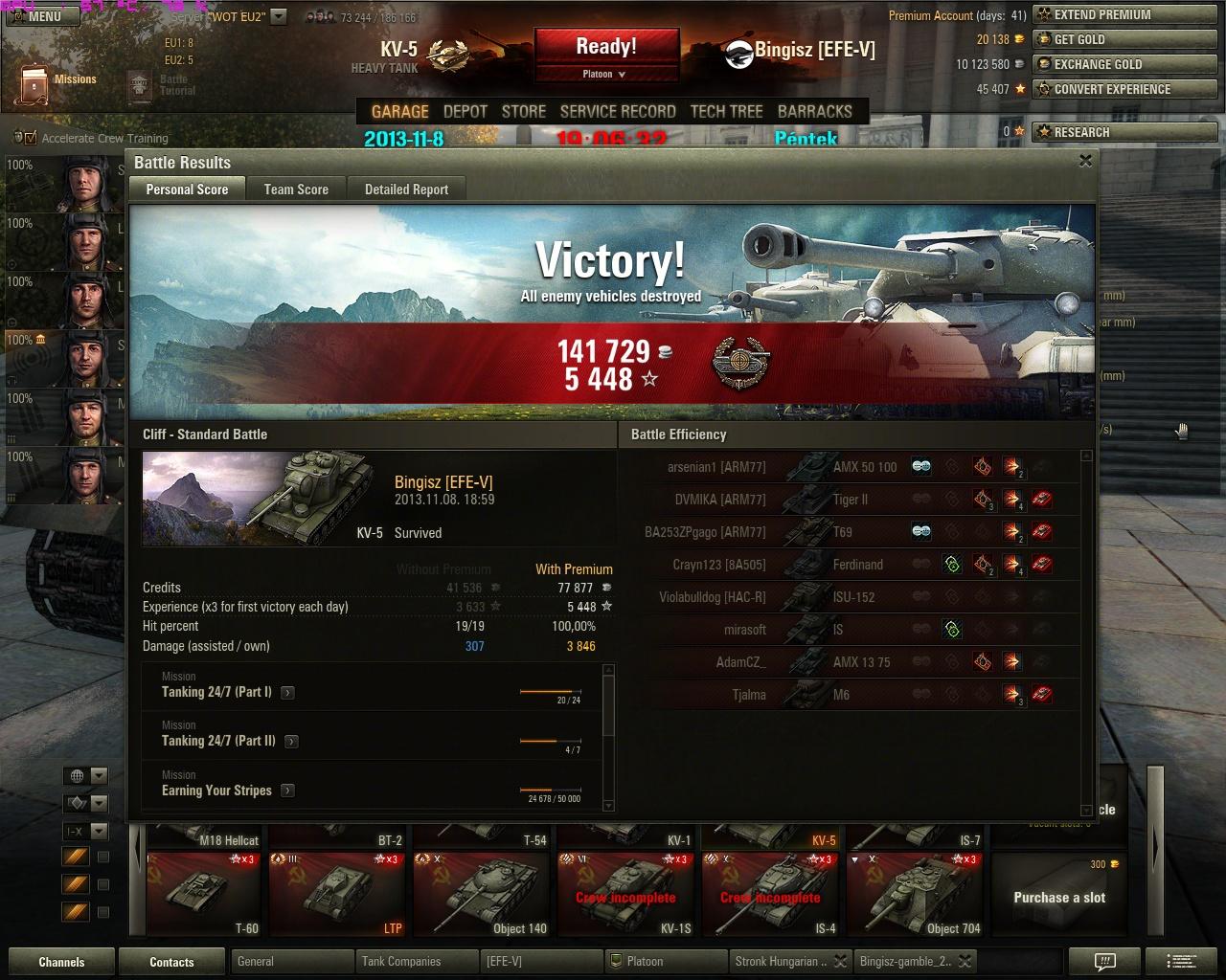En erosen szeretem, most jelenleg 57% nyeresi aranyom van vele.Termeszetesen a T29-el 59% a nyeresi aranyom, mert az is marha jo tank, de a legjobb a Tiger P-vel vagyok, 64%, es atlag 2 kilott tank, sebzest most nem tudok fejbol de olyan 1200 korul van szerintem.