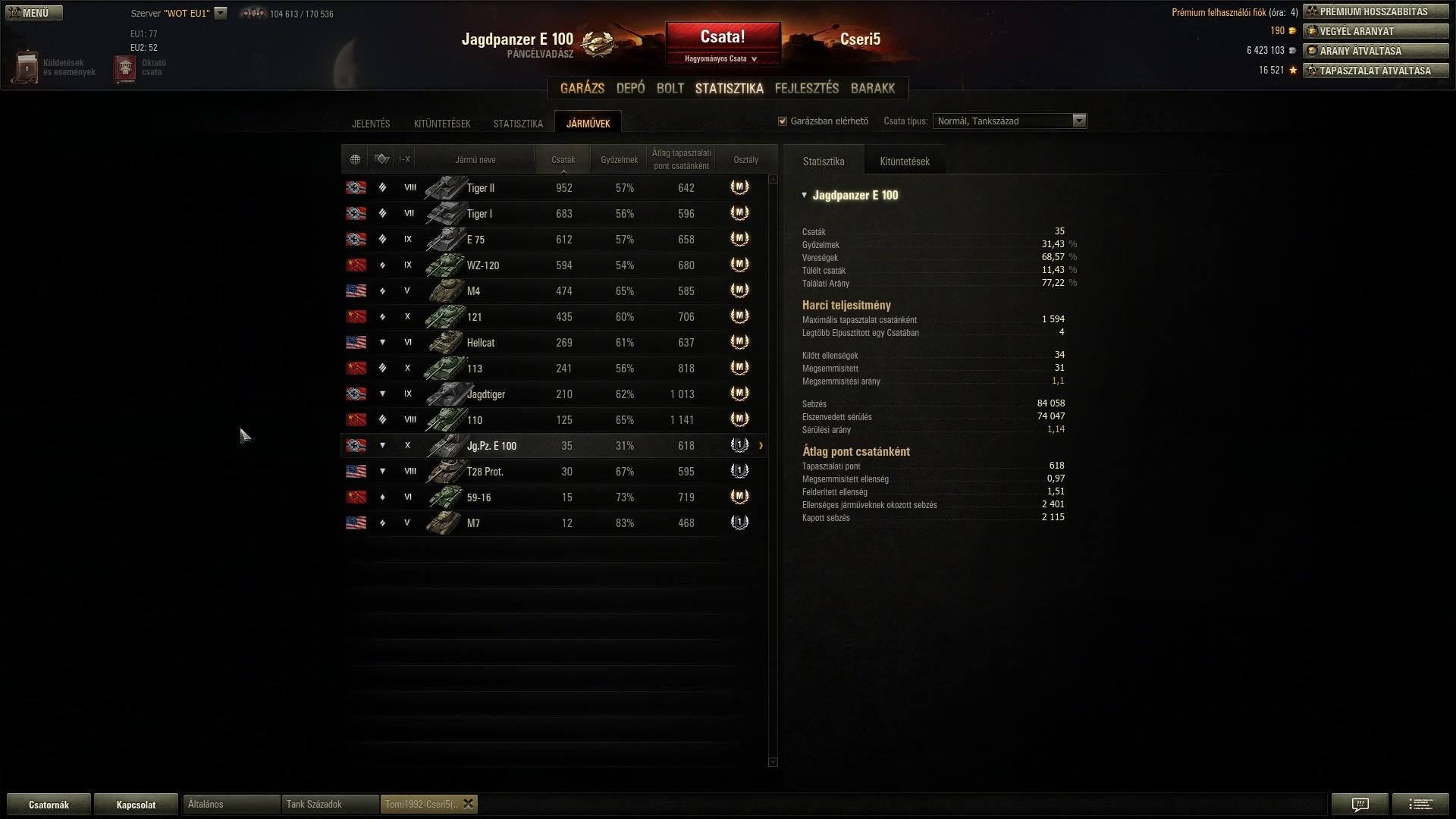 Remelem sikerul megcsinalni a sok 100 ezer TP-t, mert ha nem, akkor jobb lett volna ha olvasasra szantam volna az idot.Na, de ha elhataroztam hogy megszerzem az IS-6-ot, akkor ugy is lesz, habar nagyon unok szerencsetlenkedni alacsony szinten, habar volt par huzos csata amit elveztem, de nem sok, mert a vilag osszes Piroskaja beszallt a versenybe... -