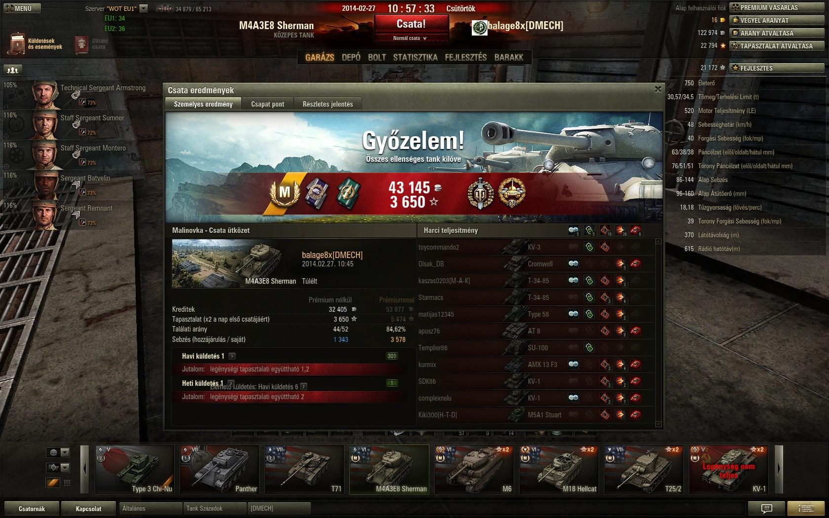 (#46367) Habib[HUN]: 9-es szinten mostanság érdekes dolgok történnek... Ma zsinórban olyan csatákba rakott be, ahol mire a harmadik golyót betöltöttem, addigra a csapatom fele-kétharmada már halott volt, pedig volt mit lőnöm, elhiheted. Máskor simán kapok olyat, hogy életmentő lövésembe belefut egy csapattárs, és vagy én, vagy vki más emiatt döglik meg. Legutóbb egy AMX szaladt be közém és az FV183 közé. 700HP-ról ki is vettem a francba, majd szépen benyeltem a csillagromboló lövését...