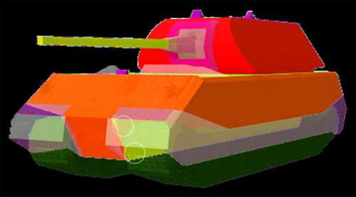A beforgatott Mausnál nem weakspot az alábbi két fehér kör? (AP/APCR lőszerrel) A felső keresztülmegy a 100 mm-es lemezen, elkerüli a láncot és a 80 mm vastag oldalpáncélba ütközik. Összesen ~240mm effektív páncél 30 fokban forgatott Mausnál. Az alsó a 25 mm-es lánc után megy az oldalpáncél felé, 150-160mm effektív páncél. Egyébként a hasa~300, az oldala 317mm ugyanígy 30 foknál.