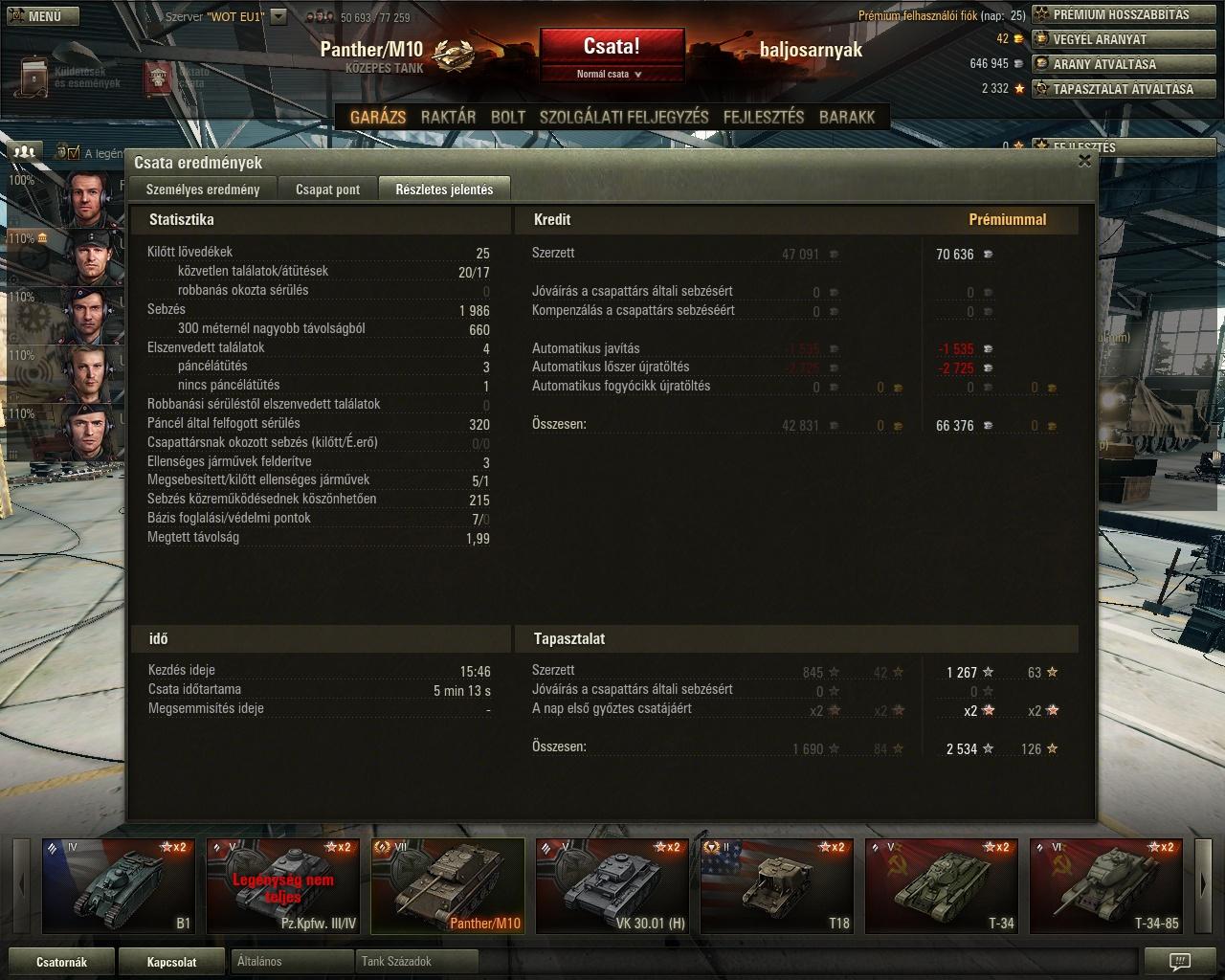 Így hoz a Panther/M10. Valami kegyetlenül durva, egy kicsit képzett játékos T7-ben lazán tud 2000-et sebezni és az ennyi pénz. Replayt csak azért nem adok, mert gyakorlatilag semmi nem történt benne, volt egy IS face to face, utána meg két artyt becserkésztem , meg két med mögé tudtam menni, az a 300+ méteres sebzés és ennyi. Na ez tényleg semmi nem volt és mégis 66K nettó.