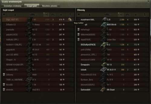 a többi eléggé 600-650 körül van, nashorn, su100, dicker max, mindazt meg ugye ki tudja, hogy mennyi statpadder (értsd olyan játékos, aki nagyon alaposan ismeri az adott tankot) megy a tankkal, de én gyanítom, hogy a hellcaton már csak a története miatt is több van (nosztalgia), de ezt abszolút nem lehet figyelembe venni, semmiféle mérés nincs erre, csak sejtés