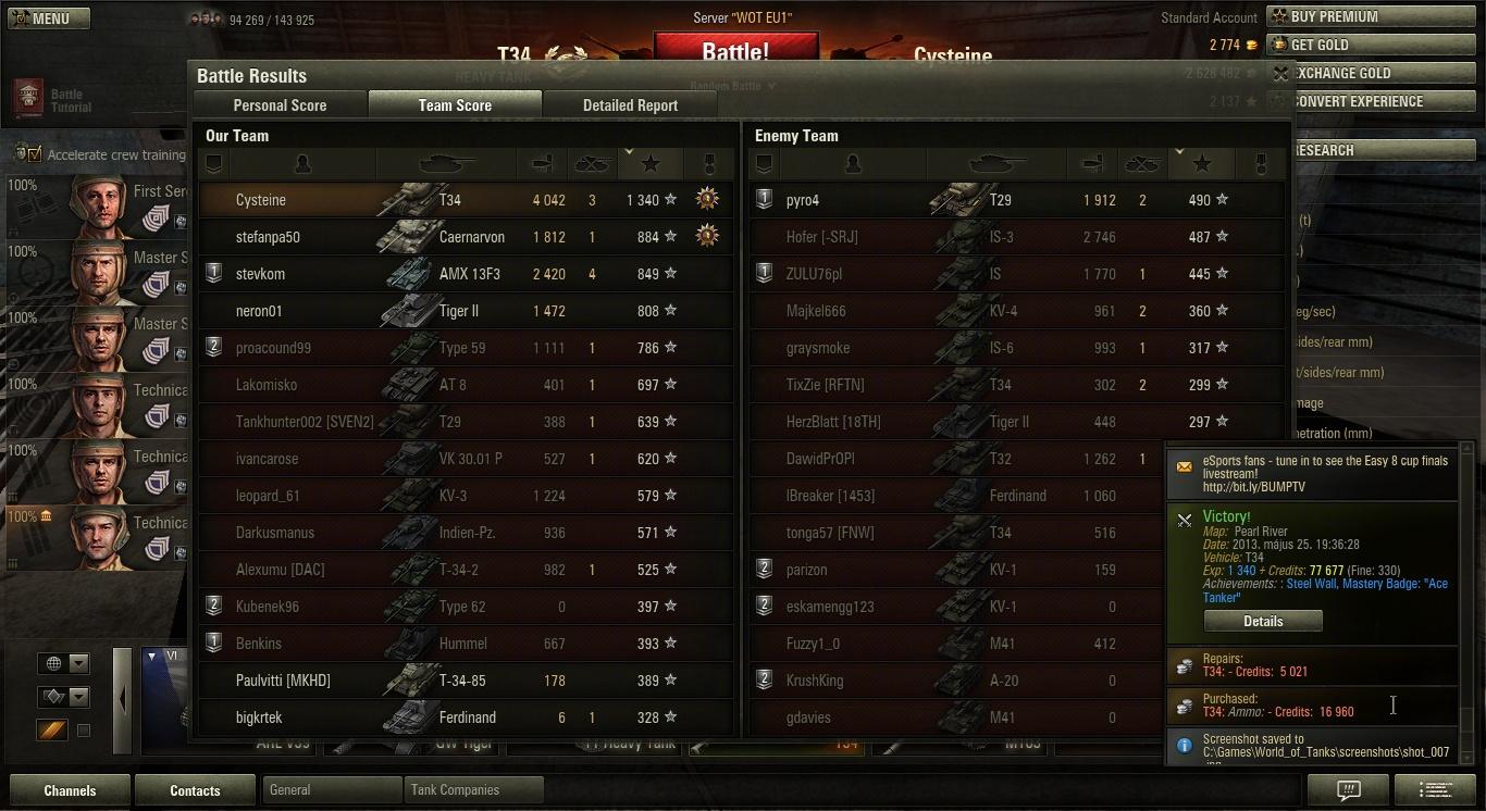 Kilőni ritkán szoktam csak tankot, főleg Tiger 2-vel. Tiger-el a végére már nagyon belejöttem, ki volt szépen fejlesztve, megtanultam kezelni is. A VK 3601H-val is elég szépen tudtam leszedegetni a végére, meg amivel minden csatában van legalább 1 destroyom az az M5A1 Stuart. Azt a tankot nagyon imádom, nem is adtam el, pedig már meg van a Type T-34 is. Ha egy kicsit erősebb lenne a páncélzat és lenne rajta jobb löveg császár lennék azzal a tankkal. Nagyon fürge, gyorsan újratölt és T5-ig bármelyik tank páncélját átlövi. Múltkor csodálkoztam is, mert egy Stug-gal kerültem szembe és szemből valami csoda folytán kilőttem. Az az egyik, ha talán nem a legjobb tankom.