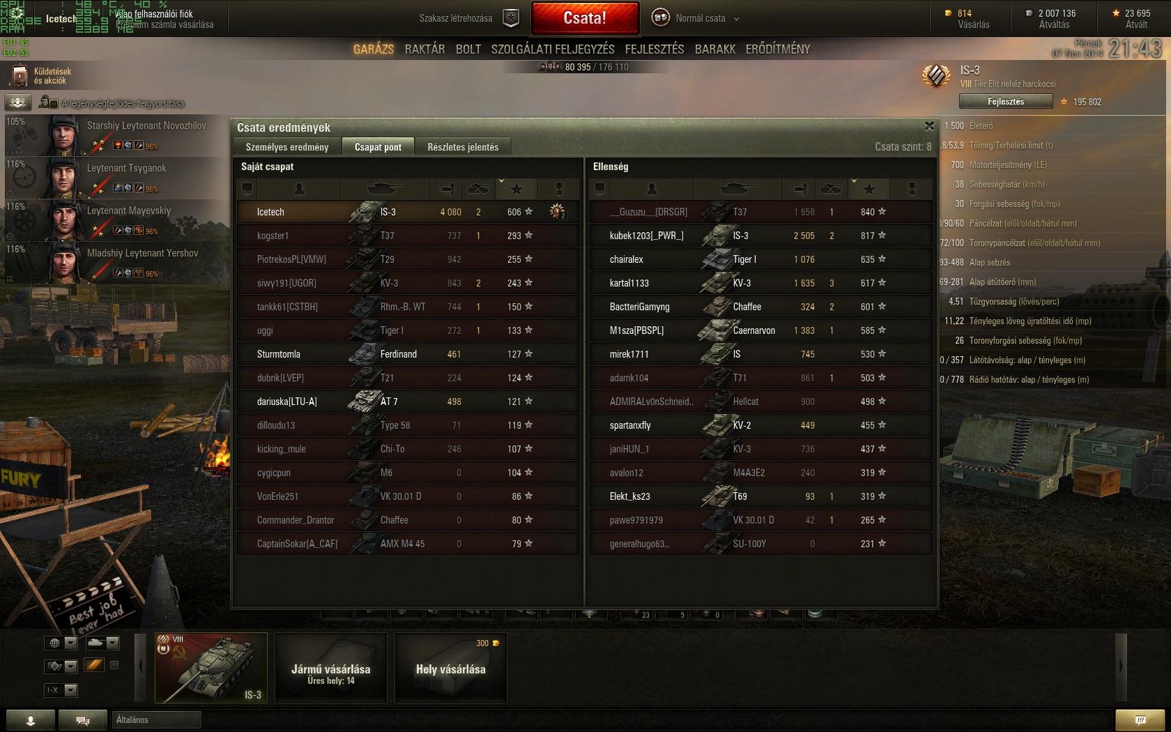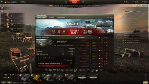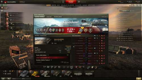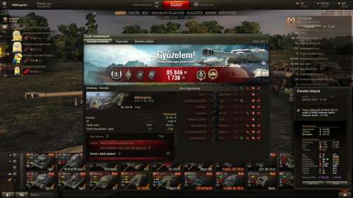 Erre csak első osztályt adott. Az első értelmesebb csatám vele, de most már a második ágyúval. Mondjuk hamarabb is felrakhattam volna a második ágyút rá, mert rájöttem, hogy úgyis szántam kb 50e szabad xp-t neki (a nagy ágyút terveztem megvenni belőle), bedobom egy részét a második ágyúba és majd azzal grindelek többet, úgyhogy 50exp használok fel, csak egy részét előbb, mint terveztem. Ha előbb gondolkodom, akkor előbb is megvehettem volna a második ágyút, na mindegy most már, de a stock ágyú elég szenvedős, észrevehetően pontosabb a második, meg nagyobb rof is. Ez már használható ágyú, bár igényli az aranyat erősen néha. 4084 sebzés + 944 assist, 3 frag.