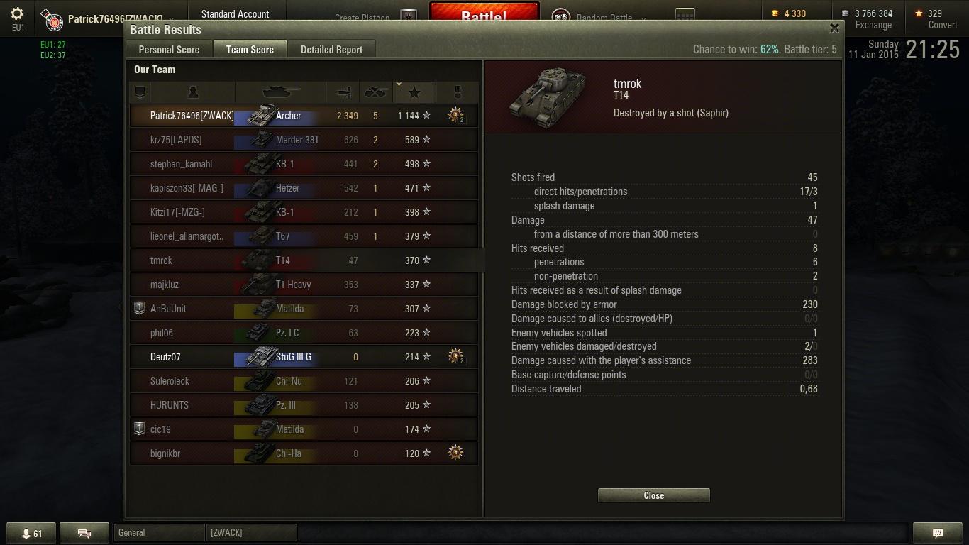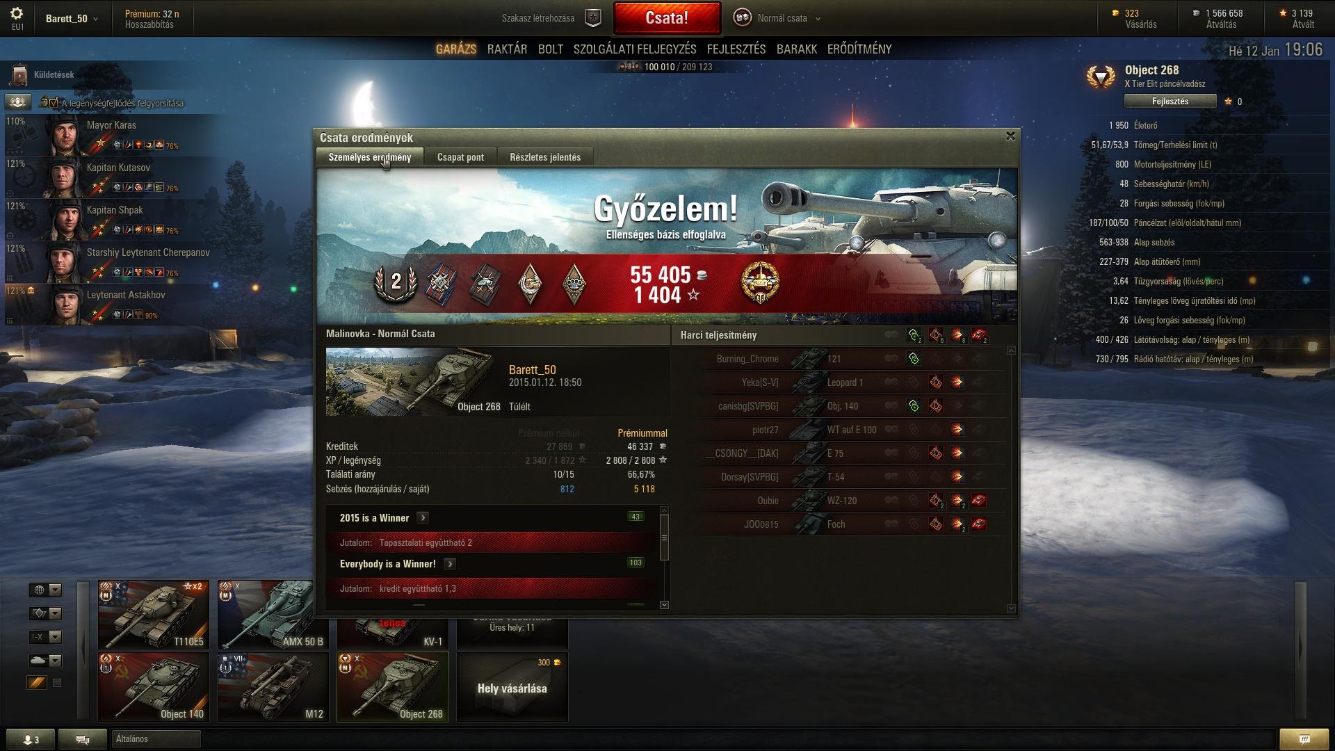 Csatában elért Achievement: Top Gun, Nagy kaliber, Őrjárat, Acélfal, Pool medál, Kritikus együttműködés, Kiváló sofőr jelvény: "Tank ász"Az utolsó killt volt olyan kedves és meghagyta nekem a szakasz társam, de egyébként teljesen fogyatékos volt az ellenfél csapata.