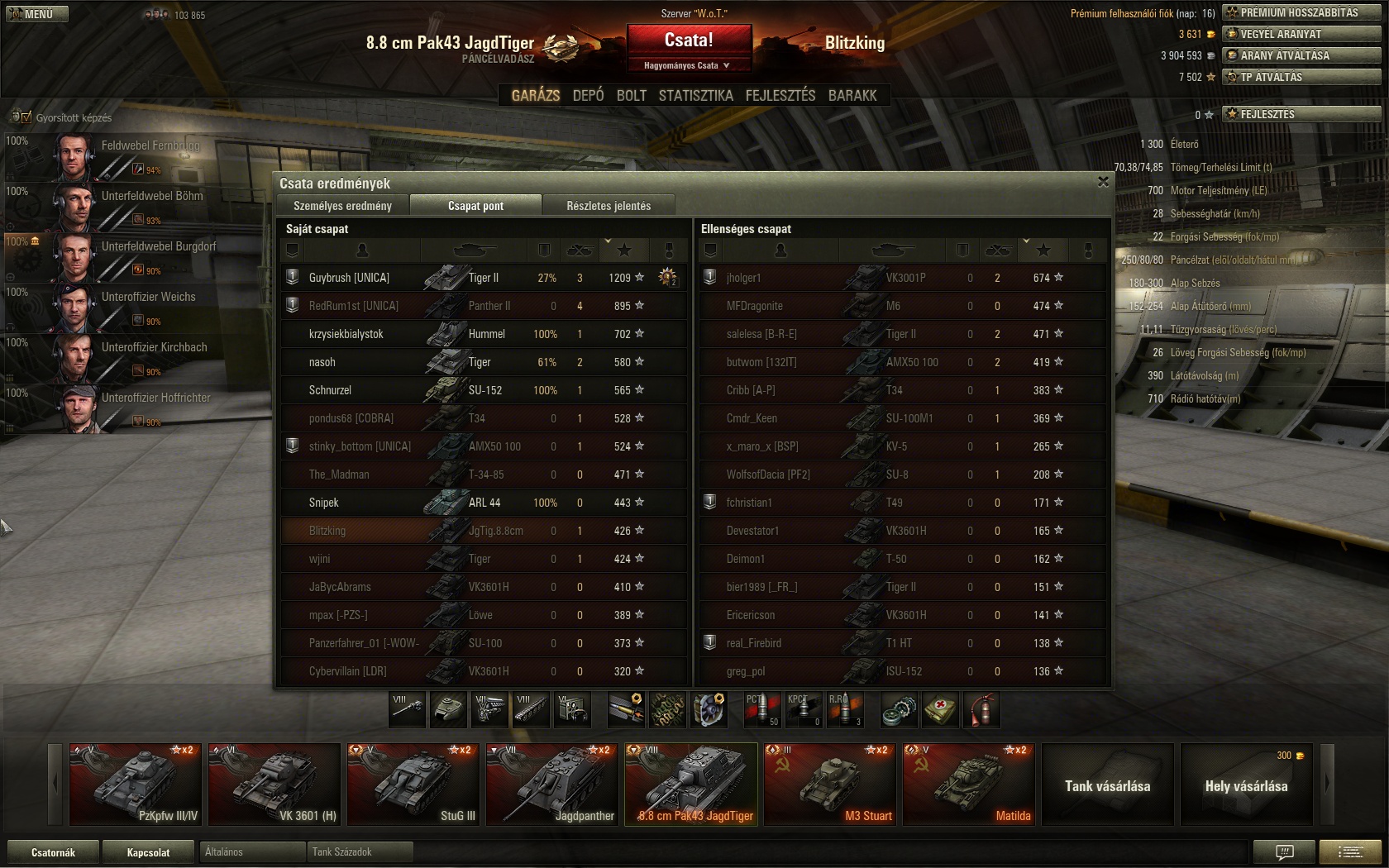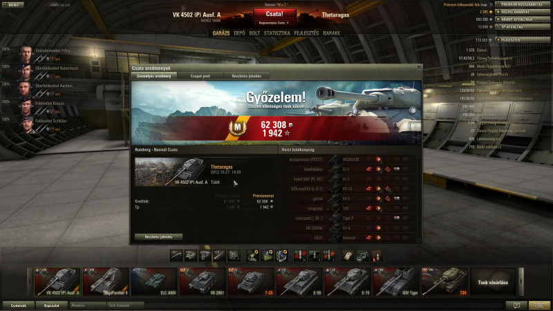 Egy jó kör Aladárral. Az elején egyedül indultam az egyik ütköző pontra, szerencsére egy kis szarkazmus után csatlakozott egy T34 és egy VK3002DB is, majd a fél ellenséges csapat legyalulása után a bázison kempelő roppant tehetséges játékosainkat is sikerült mozgásra bírni. Ha a 2 kilőtt Super Pershingből bármelyikben értelmes játékos ül, akkor már a csata elején halott vagyok, így viszont mentem egy jó kört. A Királytigrisünk küldözgette a parancsot, hogy vonuljak vissza, dehát a magyar virtus...