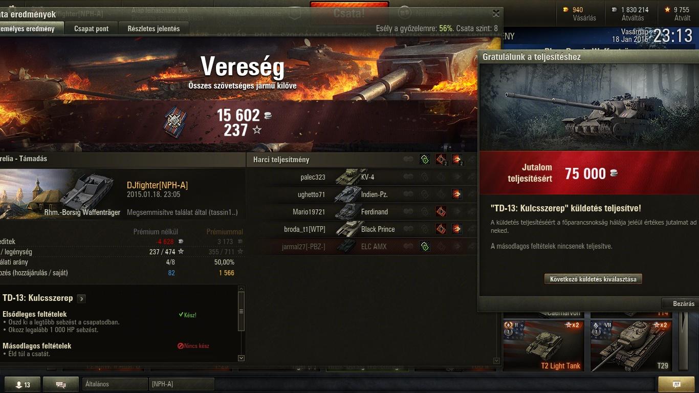 Egy-két 6k sebzéses Foch 155 kör. Tudom nem nagy szám T10-es TD-vel, de ennél jobb nem igazán lesz. Nem nekem való ez a TD-zés, baromira korlátolt így a játék, inkább maradok a medeknél. A mai játék nagy részét pedig még élveztem is vele, a végére viszont nagyon csúnyán elb*szódott az egész. Mondjuk a mai napig nem értem, miért is volt annyira OP ez a cucc, hogy nerfelni kelljen az alfáján kívül más adatait is...