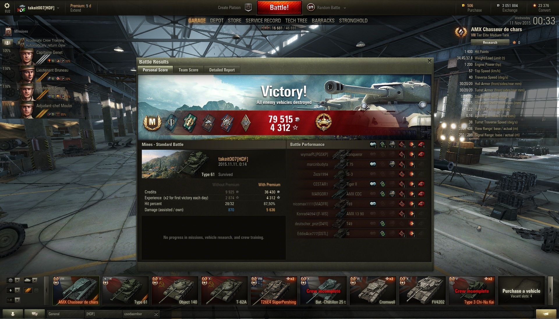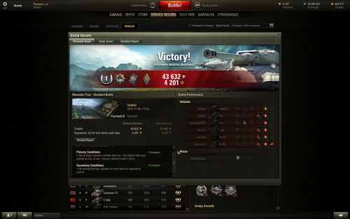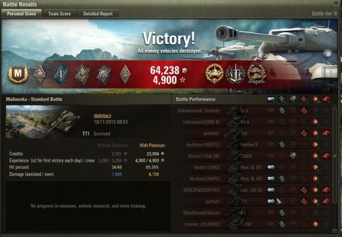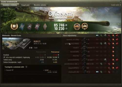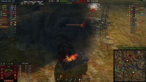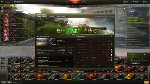 Egyik kapott egyet a tornyába aztán próbáltam fedezékbe bújni de becélzott a TD akit csak leláncolni sikerült de viszonzott egy 819 hp-s sebzést plusz kigyújtott így a maradék 59 hp egy pillanat alatt tova szállt.Végül nyertünk de ez nem minden, azért egy kicsivel többet szeretnék játszani és nem egy bekapott golyó után nézni a többieket. Plusz ugye nem egy ilyen csatát kellene duplázni.