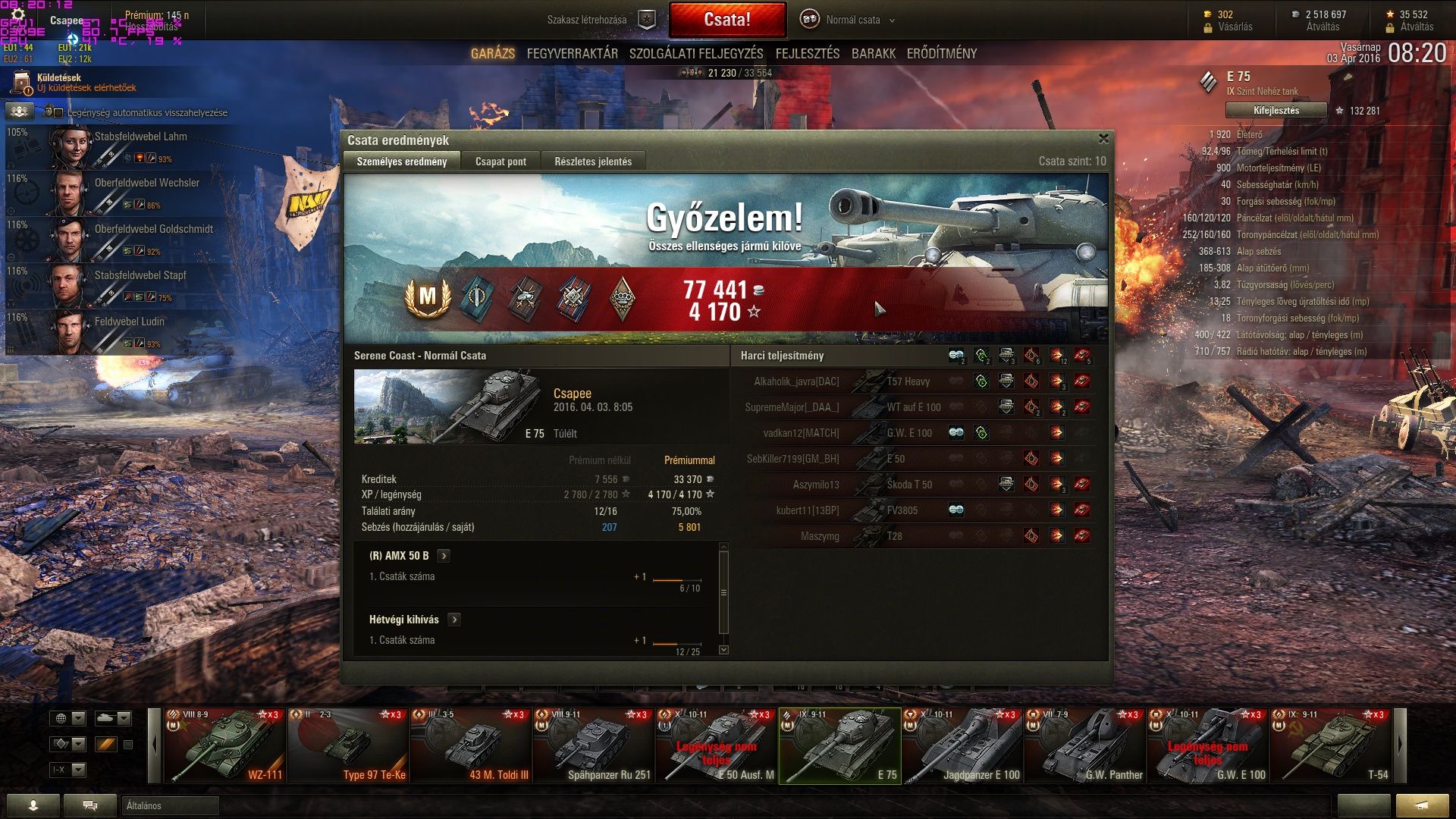 Tegnap 91%-on voltam vele, de volt olyan, hogy 4 lövésből nem találtam el az ellent, pedig a crewra nem lehet panasz. (4 skill) Most meg már 86%... Nem lesz így 3. gunmark... No mindegy.Remélem lassan megkapja a HD modellt, és hátha kap egy kis célzásidő stb. buffot mint a Tiger 2 különben nem lesz megtartós.