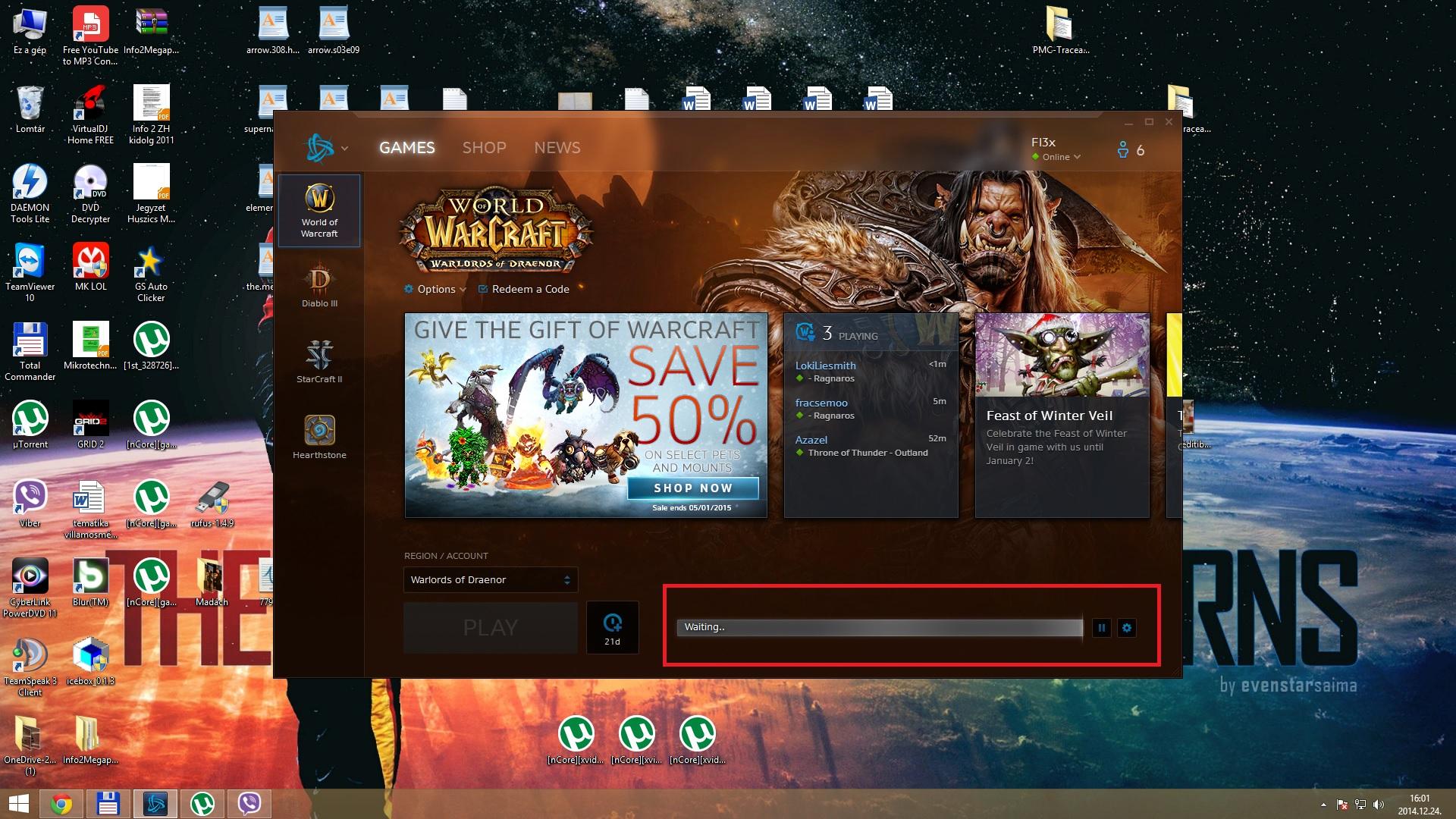 Átraktam másik vinyóra, ott elindult belépnék, de karakterválasztó előtt kidob, h kevés a mem (8gb kevés neki sajnos, nem is tudtam h ennyire geci jó játék lett a wow). Aztán blizz írta melyik 3 mapát írjam át, megtettem, el is indult belépek és kiirja h tölt le a szerverről vmit, h mit azt nem tudom mert 34GB foglal a játék.... szánalmas h pénzt kérnek és nem tudnak semmit megírni rendesen.... Bnet app aztán még egy hulladék...egyfolytában incializál ahányszor belépek, wtf?!