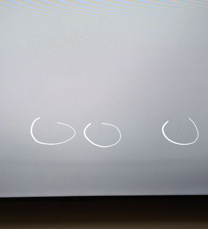 Közben megérkezett a TV, de megy is vissza a feladónak. A képernyő alsó részén sötét csík. Plusz olyan foltok, ami a tüsszentéshez hasonlít, de nem letörölhető. Illetve 2 pixelcsoport, ami mindig világosabb, mint a többi.