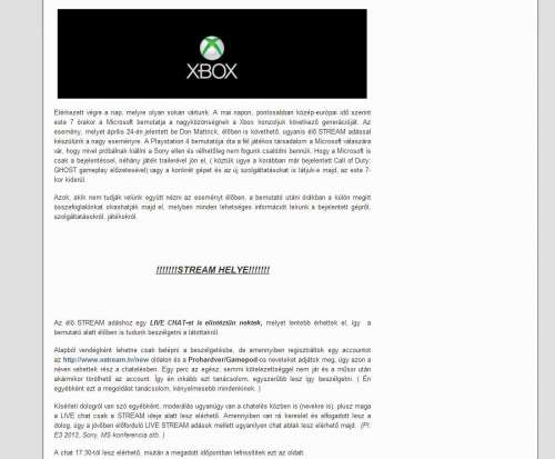 Május 21. Xbox Event. Lesz elvileg élő stream adás, és amellé hoztam össze egy live chatet is. Hogy az előadás alatt ne a topicba menjen a szöveg, hanem chateljünk. Kísérleti dolog lesz, ha bejön a népnek, akkor minden nagyobb live stream-es eseménynél használnánk ezt a megoldást.