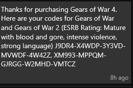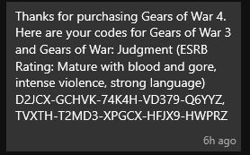 Thanks for purchasing Gears of War 4. Here are your codes for Gears of War and Gears of War 2 (ESRB Rating: Mature with blood and gore, intense violence, strong language) D*FJQ-VJ63T-FJJXW-XMRWD-JGVWZ, 7*CC3-6JFT9-RX64C-H73GX-J2R3Z