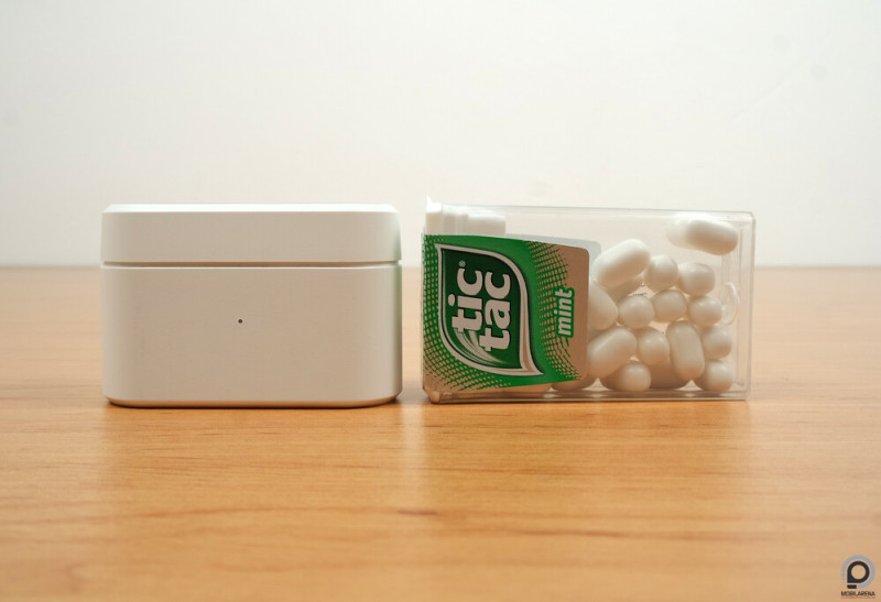 A terméket rejtő csomagolás átlagos méretű, a fülhallgató méreteihez viszonyítva mondhatni feleslegesen nagy is. A zsugorfóliát leszedve, majd a doboz tetejét leemelve egyből a töltőként is szolgáló tokkal nézünk szembe. Alatta némi dokumentáció, három szett fülkagylóba illeszthető gumiharang (S-től L-ig), valamint egy egyik végén USB-A, másikon USB-C töltőkábel található. Vezeték nélküli töltést a tok nem támogat, az USB-C csatlakozó hátulra került rajta, mellé pedig a manuális párosítást segítő gomb. A hordozó összeszerelési minősége jó, nem recseg, nem ropog, a felhasznált műanyag érzetre viszont olcsóbb hatást kelt, mint például a Redmi Buds 3 Pro bölcsője, engem leginkább egy doboz Tic Tac cukorkára emlékeztetett, mint méretre, úgy tapintásra, de azért szerepeljenek itt a pontos dimenziói: 58 × 23 × 37,7 milliméter és 39 gramm.