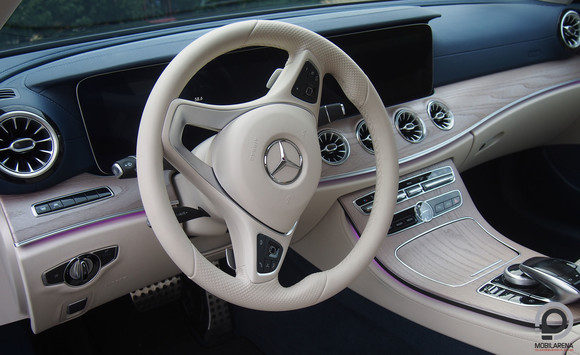 Egy E400-ast kaptunk, kétajtósat. 3 literes, V6, biturbo. 330 lóerő, 4,8 méter hosszú, irgalmatlan nagyvonalú belső kialakítással, így a “teljesen felesleges autóm van, de jó drága volt” életérzéssel telítődve üldögéltem volna benne naphosszat, mert kétségtelen, hogy ebben elég jó érzés üldögélni. Mint ahogyan menni sem rossz, a kilenc sebességes automata észrevétlenül teszi a dolgát, hogy mindig úgy induljon meg az autó, ahogyan azt az ember pontosan elképzeli. Cikkünk témájának szempontjából ez alapvetően mindegy, a fedélzeti rendszer minden E-osztályban nagyon hasonló (néhány extra jelenti az eltérést, mint amilyen a Qi töltő, amit a tesztautó is tudott), mi pedig igen kíváncsiak voltunk, hogy egy alapáron 18 milliós (a nálunk járt, felextrázott példány úgy 10 gurigával több) kocsi mit nyújt ezen a téren.
