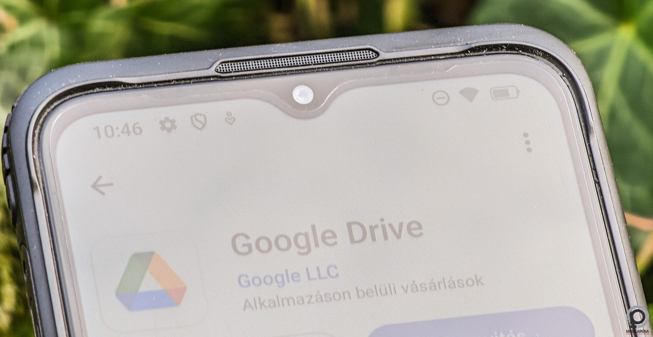 A fényerő oldalról nézve gyorsan csökken, de legalább a közepes kontrasztarány kevésbé. Az érintési érzékenység rendben van, csak van kis fáziskésés, a rezgések lehetnének erősebbek. Örömhír a beszédhangszóró balján elhelyezett értesítő LED, míg jobbra fénymérő és közelségérzékelő rejtőzködik. Egy potenciális kockázat a kijelző körül azért akad: a strapabíró telefonok szokásos, magas kereténél a műanyag perem ezúttal alacsonyabb, és a védőfólia nem sok segítséget nyújt arccal történő becsapódás kivédésére.