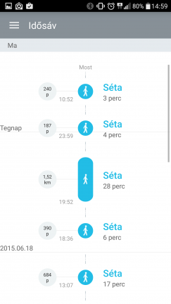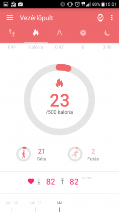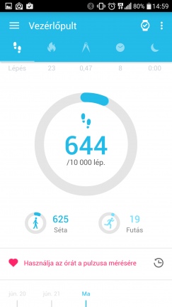Maga az applikáció végtelenül egyszerű, könnyen kezelhető, látszik, hogy az Alcatel nagyon odafigyelt erre. Négy menüpont közül választhatunk: az első a vezérlőpult, aminek adatait az óráról is fürkészhetjük. Ezek közé tartozik a lépésszámláló, az elégetett kalória, a megtett távolság, a mozgás ideje, valamint az alvásfigyelő. Az idősáv tartalmazza az elvégzett műveleteket, például hogy mikor sétáltunk, mikor futottunk, mikor mértünk pulzust, lényegében amit az órával csináltunk, az mind megjelenik ebben a menüpontban.