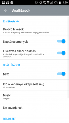 A beállítások között megadhatjuk, hogy minden, vagy csak a kedvenc névjegyektől érkező hívások esetén jelezzen az óra. Ha valaki telefonon keres minket, az óráról el tudjuk utasítani a hívást, a másik lehetőség pedig, hogy némítsuk a rezgést. Utóbbi egy kicsit bután lett megoldva, hiszen az óra ugyan nem jelez tovább, a telefon viszont ugyanúgy csörögni fog. Az emlékeztetők közé tartozik még, hogy az óra a naptáreseményekről is képes szólni, plusz azt is tudtunkra képes adni, hogy túl távol kerültünk a csatlakoztatott telefontól. Külön kapcsolót kapott az NFC, az óra kijelzőjének kikapcsolási időintervallumát is személyre lehet szabni, ezt 5, 10 és 15 másodpercre állíthatjuk be.