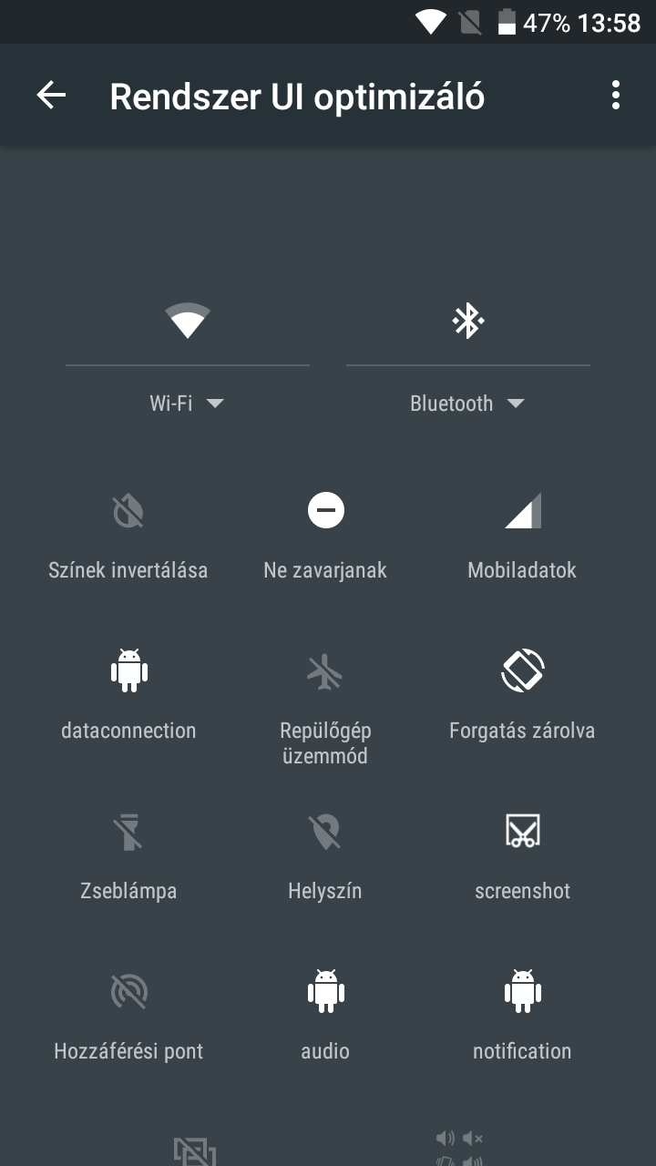Az értesítősáv érintetlen, így az első fázisban az értesítések, a másodikban pedig a gyorskapcsolók kerülnek elő a megszokott formában. A panel tartalmát és elrendezését a Kezelőfelület-hangolóval (itt Rendszer UI optimalizáló) módosíthatjuk, ami az értesítősávon található beállítások ikon nyomva tartásával jeleníthető meg a Beállítások között. A 4 x 5-ös ikonkiosztáson nem változtathatunk, ahogy nagyjából máson sem. Túl sok érdekesség nem jutott, a minimális mennyiségű és hasznosságú gesztusvezérlés kimerül a megfordítással való némításban és a szundi megfordítással való aktiválásában.