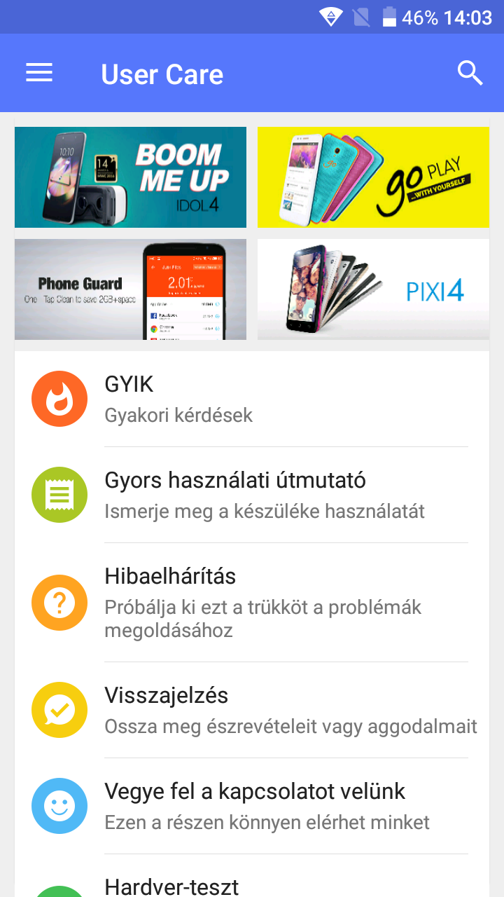 Első indításkor minden alapkészség a rendelkezésünkre áll, a Google csomagon kívül voltak szívesek előtelepíteni a Facebook és Instagram alkalmazásokat, a Deezert, Shazamot és az itthon már teljesen feleslegessé vált Ubert is. Mondjuk, bárhol máshol még jól jöhet. Az Apps és a Game Center az Alcatel saját boltja, a OneTouch Cloud pedig integrált fiókkezelést biztosít, valamint 5 GB ingyenes felhő alapú tárhelyet. A UserCare-ben mindenféle hasznos útmutató és ügyfélszolgálat érhető el, valamint egy mutatós hardverteszt, ami többek között végigcsekkolja a LED villnatótól kezdve a hangszórón át a hálózati modulokat is. A Xender Fájlátvitelen és a WPS Office-on kívül nem is rámoltak más a tárhelyre, leszámítva a SwiftKey billentyűzetkonfigurációs appot.
