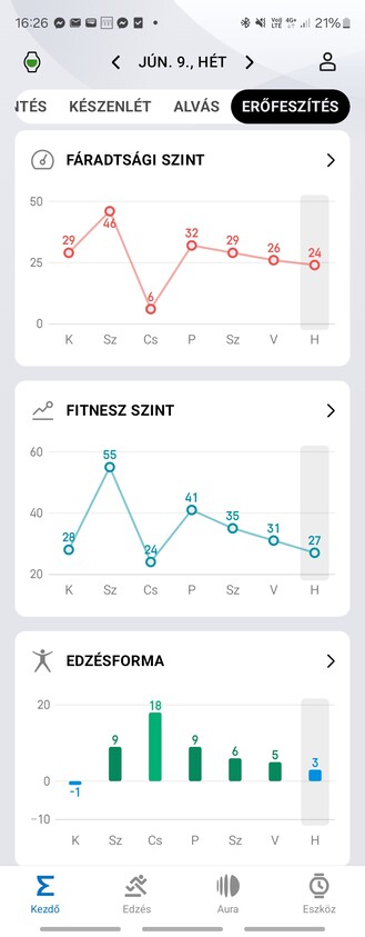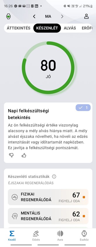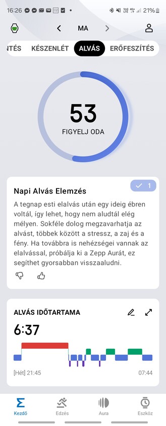 Az alvási adatok elemzése az Amazfit egyik specialitása — legalábbis erre tartják a havidíjas Zepp Aurát. Ha olyanunk nincs, akkor is kapunk statisztikát, de az kusza, nehezebb kinyerni az adott napra vonatkozó adatokat. Viszont tökre egybevág azzal, amit a Samsung is mér, ugyanakkor volt REM-fázis és ébrenlét, amikor úgy aludtam, hogy mindkét karomon volt óra, akkor az Amazfit 63, a Samsung 64 pontot adott az alvásminőségemre. Stimmelt a légzésszám is, a pulzus is. Elvileg az alvási apnoe kockázatát is kijelzi, amit a Samsung csak pont a napokban kapott meg funkcióként, a koreai óra viszont detektál horkolást is.