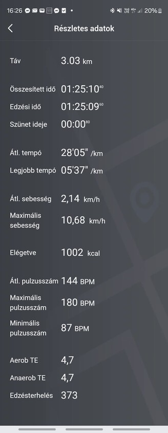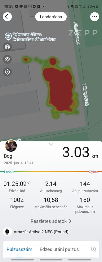 A foci volt a legjobb próbatétel, itt amúgy az Amazfit többet tud, mint a Samsung, mert ez az óra úgy gondolja, hogy kültéren fogok játszani, szóval bekapcsolja a GPS-t is, aminek az az eredménye, hogy a meccs után kvázi van egy hőtérképem arról, hogy hol álldogáltam a legtöbbet. Az Amazfit sebességet is próbál mérni, de a maximális 14,17 km/h-s tempónál rövidebb időkre még képes vagyok gyorsabb futásra, szóval ez nem túl pontos, ugyanakkor a pulzust pont ugyanúgy mérte, mint a Samsung, az Amazfit szerint 153-186 közötti volt a tartomány, a koreai óra szerint 154-184 között mozgott. Mindkét kütyü valamivel több mint 1000 kalória elégetéséről számolt be szűk másfél óra alatt. A vicces inkább az, hogy az Amazfit egy skálán értékeli is az edzésmunkát, a súlyzógépezésre egy jóindulatú kettest adott, a focira pedig egy kerek ötöst azzal a megjegyzéssel, hogy “túlzott”. Pedig nekem marhára jól esett.