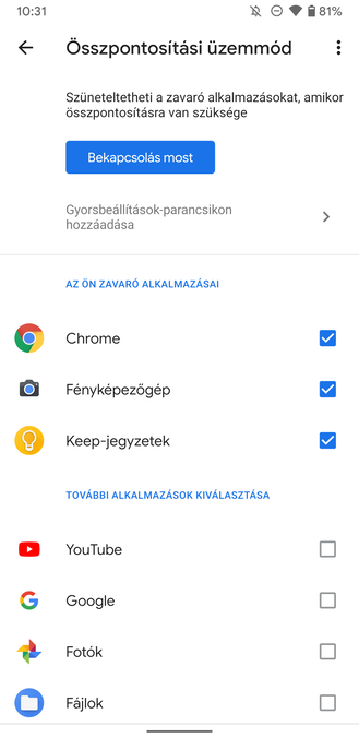 Az Android 10-zel egy időben több alkalmazás és funkció is elérhető lett, vagy most kapott hangsúlyt. A digitális jóllét például összpontosítási üzemmóddal gyarapodott (focus mode). Ezt aktiválva csak a számunkra fontos alkalmazások és értesítések érhetők el és zavarhat – egyelőre bétás opcióról van szó. A mobilfüggőség ellen pedig már nem csak alkalmazáskorlátozással vagy este beszürkülő képernyővel lehet harcolni, adott weboldalak böngészése is időkorlátot kaphat. A szülői felügyelet a Google Family Link segítségével enged monitorozást és korlátozást, akár távolról felügyelve a gyermek mobilszokásait és alkalmazáshasználatát, napi limiteket megadva. Emellett a csemete pozíciója is megjelenhet a térképen. Végül felbukkant a Pixel 3a-n az Android Auto mobilváltozata: ez a telefon egyszerűbb, akár szóbeli kezelését jelenti a gépjármű tartójába helyezve.