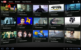 Az átrajzolt Youtube-kliens szintén nagyon pofásra sikeredett. Három nézetből választhatunk, a főképernyő (amely a home névre hallgat) három sorban jeleníti meg a számunkra ajánlott videókat, soronként öt darabot. A lista oldalra görgethető, az effekt igen látványos, nagyon hasonlít a főképernyő görgetéséhez. A Browse fülre kattintva kategóriákra bontva böngészhetjük a videókat, az egyes csoportok a jobb oldalon találhatóak, a hozzájuk tartozó videók pedig a bal oldali, a képernyő több, mint háromnegyedét elfoglaló részén láthatók. A Your channel lapon pedig a Youtube fiókunkat menedzselhetjük, a felvételeinket is itt tölthetjük fel, mivel ekkor a jobb felső sarokban megjelenik az upload gomb. A videólejátszáskor látható felület három részre oszlik: jobb oldalt a hasonló videókat és a hozzászólásokat nézegethetjük, bal oldalt fent magát a videót látjuk, alatta pedig a hozzá tartozó leírást vehetjük szemügyre.A felvételeket egyébként magas minőségben is nézhetjük, bár ehhez lényegesen nagyobb sávszélességre van szükség, megéri, a minőségbeli javulás igen látványos.