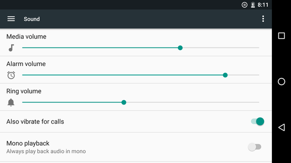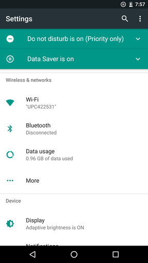 A hangerővel kapcsolatos opciókat a Sound menüpontba szervezték ki (ezeket eddig csak a hangerőgomb megnyomásával lehetett elérni), ennek ideje volt már. A Data Saver szintén újdonság, mely hű marad a nevéhez, az aktiválása a mobil adatforgalomra és az üzemidőre egyaránt jó hatással van. Bekapcsolás után a háttérben futó alkalmazások szinronizálása WiFi-hálózatokra van korlátozva. Az algoritmus az előtérben lévő szoftvert sem kíméli, ahol lehet, megpróbál fogni a csomagokon, például streaming esetén a bitrate csökkentésével, vagy a képek minőségének butításával. A Data Saver tehát menő dolog, ráadásul egy szabadon szerkeszthető kivétellistát is kapunk mellé, az itt engedélyezett appokra semmilyen korlátozás nem vonatkozik.