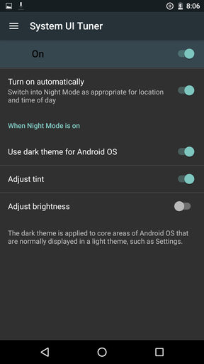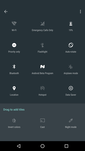 A tavaly debütáló System UI Tuner jelen sorok írójának egyik nagy kedvence volt, segítségével az állapotsáv tisztán tartásának új dimenziója nyílt meg. Az N megjelenésével tovább durvult a szitu, szinte minden ikont ki lehet irtani (nagy hiba, hogy a Data Savert egyelőre nem), plusz egy rakás más jellegű extrával is bővült a repertoár. Ilyen például a nagy visszatérő sötét téma, a kijelzőt f.luxosító éjszakai mód és a kijelző R, G és B csatornánkénti kalibrálása. Az elővarázsolásához egyébként a gyorsbeállítások felület jobb felső sarkában található fogaskerek pár másodperces nyomva tartása szükséges, majd pedig irány a beállítások app.