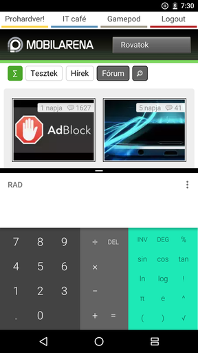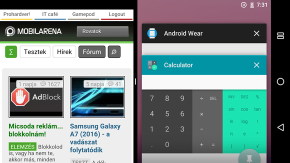 Az osztott képernyős módot a multitasking gombot hosszan nyomva, vagy ujjunkat a képernyő aljáról felfelé húzva aktiválhatjuk, igaz, utóbbit külön engedélyezni kell a System UI Tunerben. A fejlesztői előzetesben ez már szinte az összes gyári alkalmazással működik, a legtöbb esetben egyedi átméretezett UI-jal (azaz nem a vágjuk le a felét módszer alkalmazásával), utóbbira a számológép, a tárcsázó és a YouTube a legjobb példa. Fontos kiemelni, hogy a régebbi Android verzióra készült appok esetében nem működik automatikusan a dolog, a fejlesztőnek kell engedélyezni. Megadható a minimálisan szükséges kijelzőméretet is, azaz például a fejlesztő kikötheti, hogy a képernyő felénél kisebb helyet nem foglalhat el az adott alkalmazás. És ez az igazán nagy különbség a már létező androidos megoldásokkal szemben, az egységes követelmény- és szabályrendszer alapfeltétele a jó felhasználói élménynek.