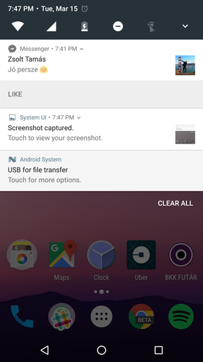A Google szinte minden verzióban hozzányúl az értesítési rendszerhez, ami alól az Android N sem kívétel. A panelt lehúzva már első blikkre látszanak az eltérések: búcsút inthetünk a különálló kártyáknak, a rendszerüzenetek egy egybefüggő felületen láthatóak, ez azonban nem jelenti azt, hogy ne különülnének el egyértelműen. Az egyes értesítések felépítése is változott, az új sablonnak megfelelően nagyobb hangsúlyt kap a küldő profilképe, mely jobb oldalt látható.