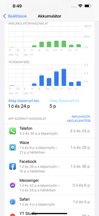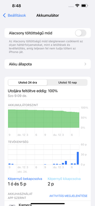 Amiben a Pro Max irtó erős, az az üzemidő. Egy teljes napig tud videót lejátszani, ami azért nagyon combos, de ha böngészgetünk, akkor is 12-14 órányi töltő nélküli időre készülhetünk. Ezeket az eredményeket a mindennapi használatra lefordítva pedig akár három napnyi készenléti időre is át lehet számolni, nyilván a 4K videózás és a játék zabálja leginkább az akkut, de nemigen tudok olyan életszerű szcenáriót elképzelni, ami azt eredményezné, hogy nap vége előtt lemerül a termék. Ez a Pro Max óriási előnye a Pro modellhez képest, miközben az sem rossz ilyen szempontból, de ez az egy töltéssel legtovább működni képes iPhone valaha. Zsinóron 27 watton eszeget (ennél azért bőven van jobb eredmény már a piacon), vezeték nélkül 7,5 wattot vesz magához, MagSafe adapterrel ennek a dupláját. Nem tölt túl gyorsan, de ritkán kell etetni, nekem ez a forgatókönyv szimpatikusabb, mint az egy nap alatt elfáradó, de 40-50 perc alatt feltölthető konkurensek, mert ehhez a 40-50 perchez a megfelelő adapter kell. Oké, itt pedig a Lightning, de azért háromnaponta csak hazaeszi az embert a fene, ha meg nem, akkor mindenhez kell vinni töltőt egyébként is.