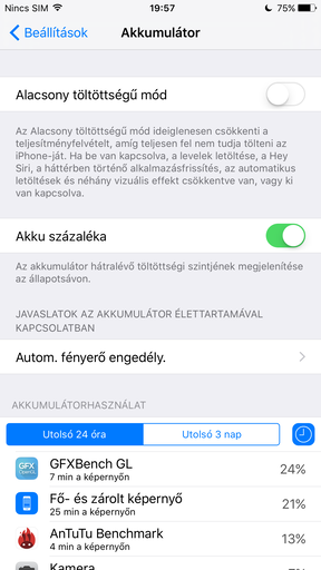 Mindenképpen érdekes, hogy amíg a tavalyi modellben egy 2915, addig a mostaniban egy 2750 mAh kapacitású akkumulátor kap szerepet. Ettől függetlenül az Apple továbbra is 24 óra beszélgetési 384 óra készenléti időt ígér, és már a kistestvérnél is láthattuk, hogy az új hardver kevésbé energiaéhes, mint az eddigiek, szóval lehet hinni ennek. A valóság sem mutat mást, fél óra navigáció, némi facebookozás, sok 4G-s böngészés, valamin körülbelül fél óra csevegés hatvan százalékba került, vagyis a nap végére még bőven maradt nafta a telepben. Egyértelmű, hogy az iPhone mobilok között a 6s Plus bírja a legjobban, ha nem nyomogatja állandóan valaki a készüléket, akkor a két napos üzemidő simán kihozható belőle, a filmezést nagyjából 7-8 óráig bírja egy töltéssel. Az iOS 9-ben már akkumulátorkímélő üzemmódot is találunk, ami kicsit visszaveszi a teljesítményt (amit nem lehet megérezni). A programok éhségét százalékok és percek szerint is láthatjuk.