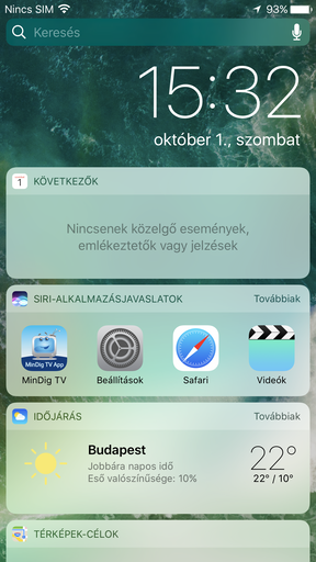 Az iOS 10-ről és az iPhone 7 szoftverfelületéről már részletesebben is beszámultunk, így most itt az alapokra térnék ki. Az Apple mobilfelülete nem használ menüt, így minden indítóikon a főoldalon kap helyet. A gyári appokat immáron törölni lehet, bár ez inkább szőnyeg alá söprés, mert csak az ikonjuk tűnik el, tárhely nem szabadul fel. A telefont felemelve vagy a főgombot megnyomva felvillan a zárolt képernyő az értesítésekkel, immáron a slide-to-unlock sáv nélkül (ha a Touch ID védelem aktív, a főgombot megnyomva és felengedve mindjárt a főképernyőre lehet jutni). A zárolt képernyőt balra húzva indul a kamera, jobbra pedig a Spotlight kereső és Mai Nap nézet érhető el, széles körben paraméterezhető widgetekkel. Ez utóbbi a főoldalról és a legutóbbiak/értesítések oldalról is előcsalható, a widgetekre tehát több figyelmet fordít az Apple. A Siri a főgomb hosszú lenyomására ugrik fel, a hangasszisztenst már a harmadik féltől származó alkalmazások is használhatják.
