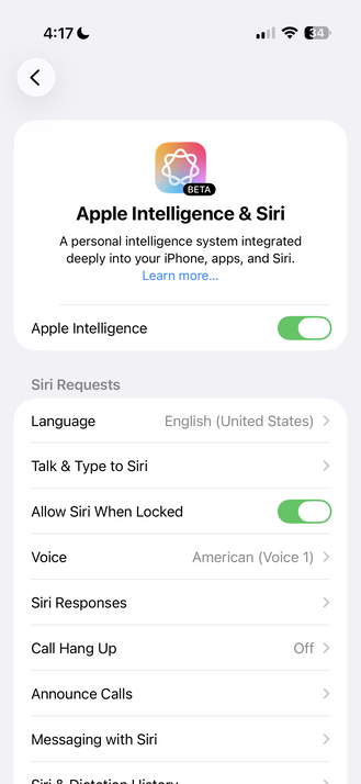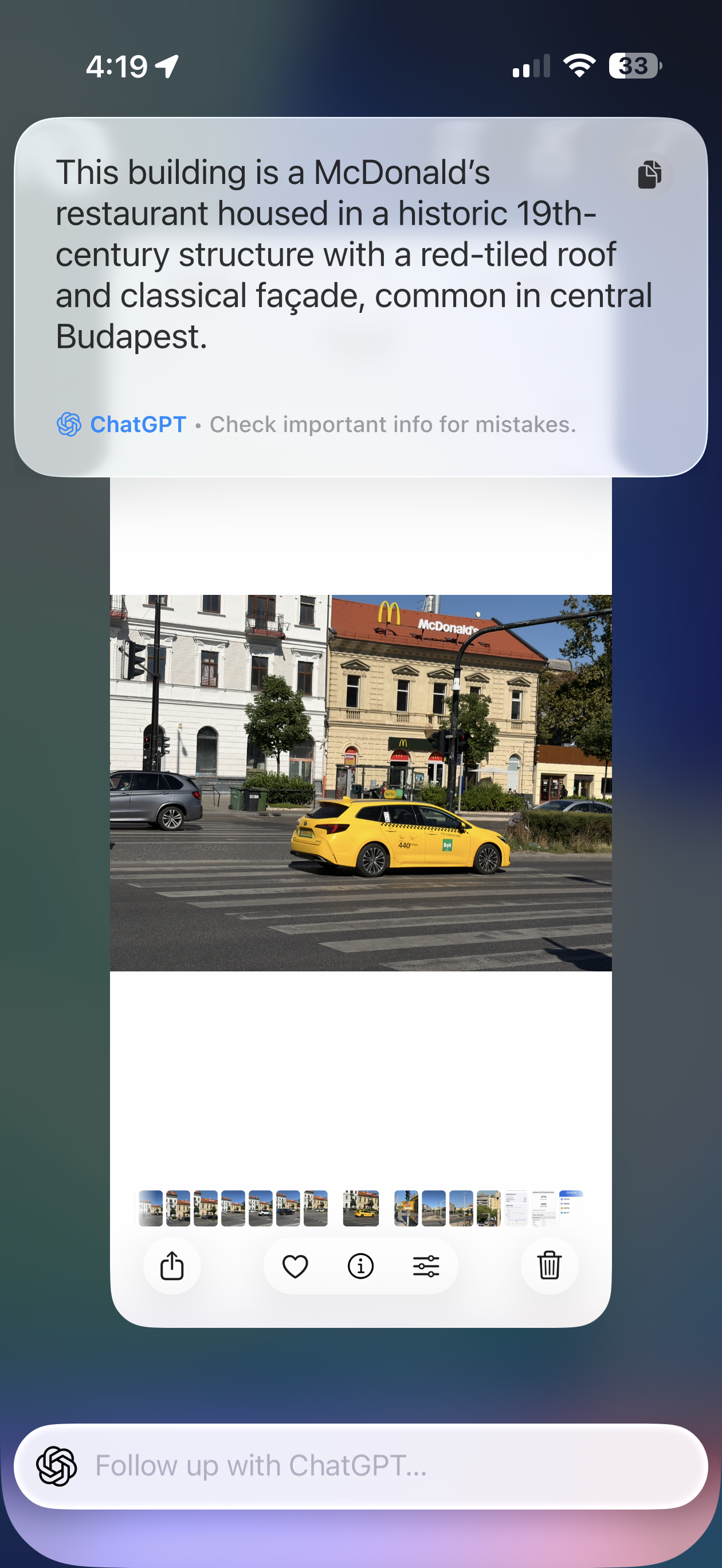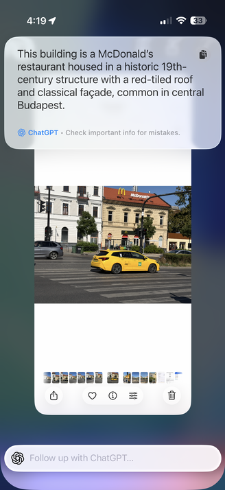 És persze bővült az Apple Intelligence eszköztára is, bár az élő fordítás (ami az üzeneteknél, a FaceTime hívásoknál és a normál telefonhívásoknál érhető el) magyarul továbbra sem kommunikál. Persze a fotógalériában itt is van lehetőség eltávolítani a nem kívánt részeket (ha egy fejet akarunk törölni, akkor azt elmaszkolja, ami amúgy tök hasznos például a közösségi médiába szánt fotókon, ahol gyerekek is vannak), no meg van egy rakás szűrő, de jóval kevesebb AI-trükköt tud az Apple, mint a legtöbb konkurens. Képes arra is, hogy a kijelzőn levő tartalmat elemezze. Ha angolra állítom a régiót és a nyelvet is, akkor a Siri megért egy csomó utasítást (lehet üzenetet küldeni, navigálni, beállításokat kapcsolgatni), ráadásul külsős appokat is meg tud hívni, de ehhez angolul kell hozzá beszélni. Ha csak simán kérdeznénk valami random dolgot, akkor a ChatGPT-t kéri meg a feladat végrehajtására, ami túlmutat egy sima Google keresésnél, de például azt is megcsinálja, hogy egy fotón látható tárgyról ad információt. A jegyzetekben is lehet képet generáltatni akár firkából is, plusz van a Playground, ahol egy meglévő fotóból lehet előállítani valami furát. Készíthetünk emojit (ha nem lenne elég az a 3700, amit a rendszer alapból tud), illetve van írássegéd (writing tools), ami korrektúráz, megír helyettünk ezt-azt, különböző stílusokat használ igény szerint — de csak angolul működik.