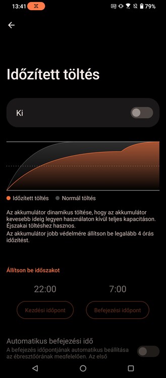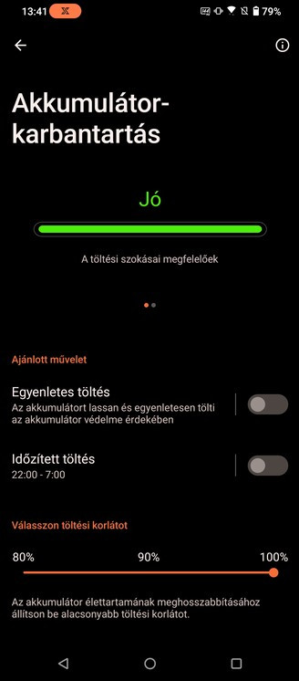 Az összesen 6000 mAh-s akkumulátor 65 wattos töltővel etethető, igény szerint állítható, hogy csak 90%-ra töltse fel magát a cucc, hátha így később degradálódik az akku. A teljes töltés 42 perc alatt megoldható, de azt is kérhetjük, hogy lassabban menjen végbe a folyamat, hogy kevésbé melegedjen a termék, illetve van átfolyó töltés is, ami játék közben annyit tesz, hogy csak annyi áramot vesz fel a telefon, ami az aktuális tevékenységhez szükséges, de az akkumulátort nem tölti — így is a melegedést igyekszik csökkenteni, a 65 wattos töltés ugyanis további hőtermeléssel jár. A nagy kérdés persze az, hogy meddig megy el így a készülék, de itt igen szélsőséges értékek jönnek ki a használat függvényében. Masszív játék néhány óra alatt kinyírja az akkut — de hát ez mindenhol így van. Full HD videót viszont valami 20 órán keresztül tud szolgáltatni a mi próbáink szerint, ha pedig valaki egyáltalán nem játszik és nem vesz fel filmeket 8K-ban, akkor átlagos ügymenet mellett a három napos készenlét is benne van a pakliban.