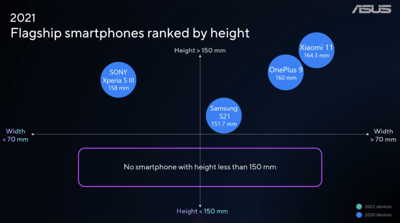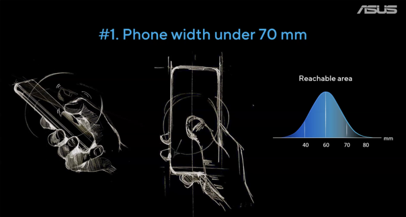 Szóval a koordinátarendszerben kirajzolódott egy jól definiálható tartomány, ahol konkrétan nincs semmi, viszont a felmérések alapján pont az optimumot fedi le. Úgyhogy az Asus ide pozicionálta a Zenfone 8-at, ami alacsonyabb, mint 150 mm, keskenyebb, mint 70 mm, de még nem jelent komoly kompromisszumot az akkumulátorméret, a megjelenítés és a teljesítmény tekintetében. Ehhez hozzácsaptak még néhány olyan tulajdonságot és funkciót (legyen meglepi), ami rendre kimarad (vagy szóba se kerül) manapság, et voilá. Statisztikailag a felhasználók több, mint felének a Zenfone 8 ellenállhatatlan kell, hogy legyen.