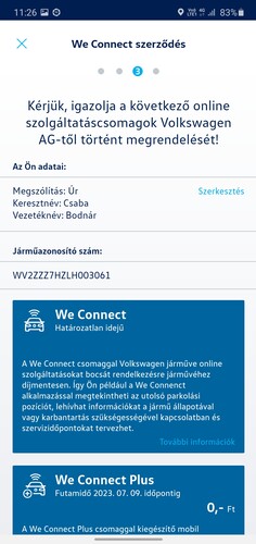 Ez a rendszer teljes egészében, a jármű típusától függően 1 vagy 3 évig ingyenesen jár (függően attól, hogy a kedvezőbb árú Discover Media vagy Composition Media, esetleg a feláras Discover Pro infotainment rendszert választunk), ám ha szeretnénk meghosszabbítani, akkor 1 évre 79, vagy 2 évre 139 eurót fogunk fizetni a We Connect Plus szolgáltatásért. Amennyiben igényt tartunk rá, az Európai Unió területén bárhol használható Cubic Telecom előfizetést is bármikro tudunk kötni a kocsiban, így az autó hotspottá is válik, a jelenlegi árak: 2 GB-os csomag, 30 napos határidővel 2570 forint, 5 GB csomag 90 napra 5800 forint, 25 GB-nyi adatkeret egy évig felhasználhatóan pedig 27 500 forintba kerül, egyidejűleg akár 8 eszköz kezelésével. A We Connect szolgáltatások futamidő nélkül állnak rendelkezésre: műszaki segélyhívás, járműstátusz, ajtók & világítás, automatikus balesetjelentés, járműállapot jelentés, menetadatok, parkolási pozíció, szervizidőpont tervezés.