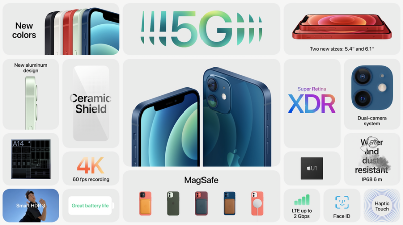 A szokásos szeptemberi időponthoz képest némi késéssel, de végül hivatalosan is bemutatkozott az iPhone 12-széria. Ahogy azt a legutolsó előzetesek alapján sejthettük, négy készülék érkezett, így a legfrissebb generáció a következőképpen alakul: iPhone 12 mini, iPhone 12, iPhone 12 Pro és iPhone 12 Pro Max. Visszakerült az aktuális fogalmak közé a MagSafe (igaz, most már nem a MacBookok mágneses töltőjeként, hanem a 15W-ra fejlesztett vezeték nélküli töltés a mobiloknál). Szögletesebb a design, már-már a korábbi, négyes és ötös szériákra emlékeztet a keret, viszont a széles notchról továbbra is megtaláljuk az utóbbi évek iPhone-generációit is. Megjelent a Ceramic Shield, ami az Apple definíciója szerint az üvegek belső szerkezetébe nanoméretű kerámiakristályokat juttatva négyszeresre emelte az ütésállóságot, nem mellesleg pedig az üveg egy síkban van a kerettel. Ez a technológia szintén benne van mind a négy termékben.