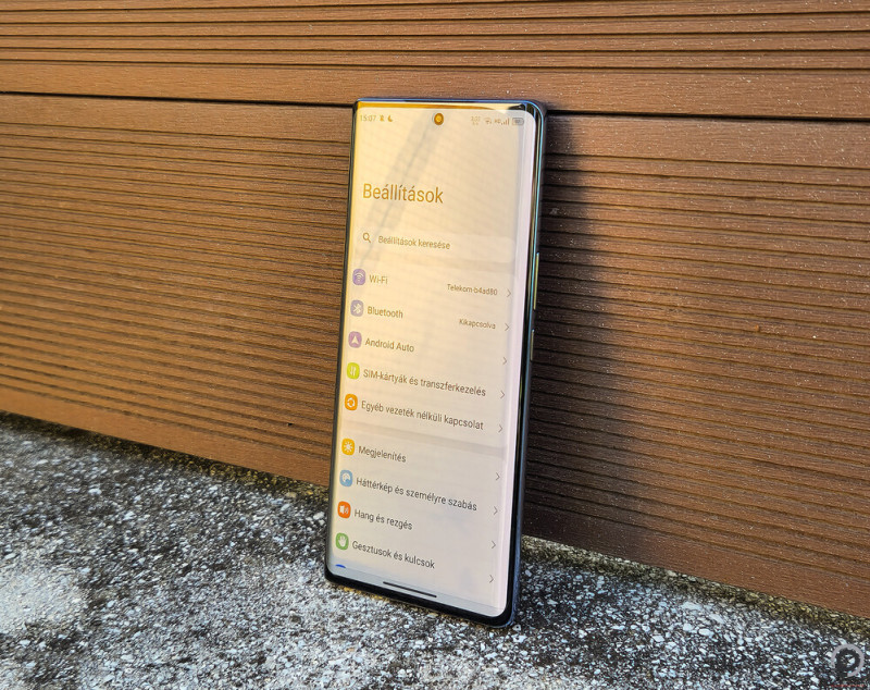 Felnő ehhez a 6,67”-es és 1080 x 2400 pixeles AMOLED kijelző a túloldalon, és bár előfordul egy-egy honlapon vagy a komolyabb 3D játék közben dadogás, a legtöbbször roppant gördülékeny a 120 Hz-es működés, pontos érintési érzékeléssel. Mondjuk a termékoldal 1300 nites, pontszerű fénysűrűsége hiányzik, ám az egész képernyős 541 nit, amit mi mértünk, tökéletes feketékkel és betekintési szögekkel bőven elegendő, hogy odakint minden látsszon a tartalmakból.