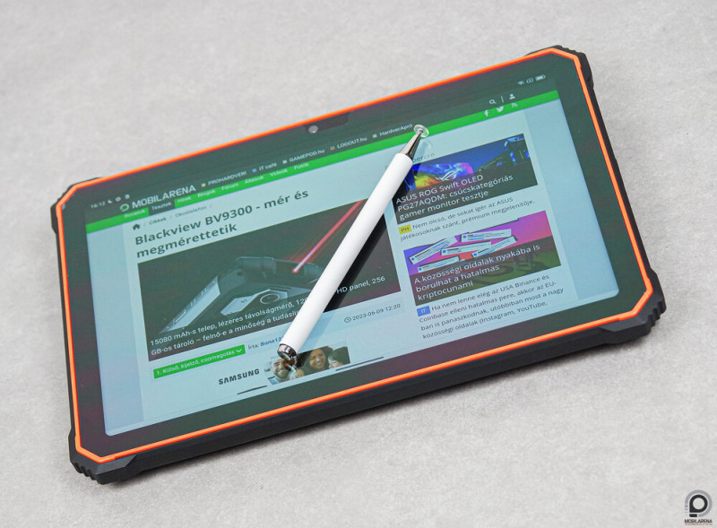 De akad még egy stylus is a pakkban, mert bár Galaxy S23 Ultra-féle digitalizálót a képernyő nem kapott, de azért a mellékelt tollal is rendben lehet a képernyőn bökni és görgetni. Csak épp az a furcsa, hogy a toll vége nem hegyes és puha, hanem lapos, kerek és kemény, és bár könnyen billen oldalirányba, könnyen meg is tudja karcolni a széleivel az előre felragasztott fóliát. Miért lett ilyen a kialakítása?