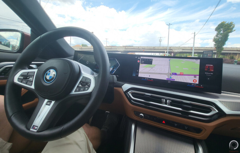 Az i4 rendszerének hivatalos neve is van: ez itten az iDrive OS 8. Kapásból tud vezeték nélküli Apple CarPlay-t és Android Autót, ezek remekül működtek. A két kijelzős megoldás viszont néhol még kihasználatlan és nem mindig tudott mit kezdeni a lehetőségekkel a tervezőcsapat, ráadásul sok a redundancia is. Kezdő villanyautósok egy ideig bizonyára figyelgetik azt a két fix skálát, ami a vezető előtti terület két oldalán van: a visszatöltés hatékonyságának megjelenítése és a sebességünk kijelzésének feladata hárul rájuk. Utóbbi totál felesleges, mert mellé van írva egy könnyebben értelmezhető számmal is, utóbbit pedig meg fogod unni, tényleg. Ja, a sebesség a HUD-on is látszik (meg a Waze felületén is, ha az fut), szóval ez minimum három kijelzés kapásból, de néha inkább négy. A két szélső skála közötti területtel is lenne még munka, bár ide ki lehet tenni a navigációt. De csak a gyárit (ami tényleg elég satnya), meg Android Auto esetén a Google Mapset, Apple Carplaynél pedig az Apple Mapset, ha a Waze van üzemben, akkor a szoftver ikonja árválkodik egymaga a hatalmas kijelzőn, ami azért elég fapados megoldás ahelyett, hogy odaírnák, hogy egyelőre nem támogatott alkalmazás. Ha nem a térképet rakjuk ide, akkor az autónk rajza látszik és a pillanatnyi fogyasztás, vagy ha ez sem kell, akkor a semmit lehet bámulni.