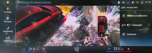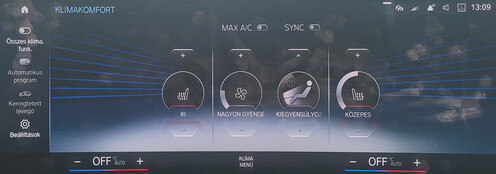 Van személyi asszisztens, de sajnos nem tud magyarul, viszont a klímapanelt is a rendszerbe költöztették (kivéve két gombot a maxra járatott első és hátsó páramentesítéshez), ami — őszintén — nem baj akkor, ha nekem nincs más elképzelésem, mint a hőfokot beállítani, aztán intézze maga az egészet. De ha akarnék ülésfűtést (ami szintén automatikusan is bekapcsolhat) az tök remek, mert ha aktiválom, akkor a rendszer alsó sávjában megjelenik egy ikon, amit megérintve visszajutok a klíma opcióihoz, hogy kikapcsoljam. De ha ki van kapcsolva, akkor ez az ikon eltűnik, szóval a bekapcsoláshoz mindenképpen túrni kell, márpedig én viszonylag gyakran állítgatom ennek az erősségét téli napokon, bár van automatikus mód, ami elvileg kitalálja, hogy mikor fázik az ülepem. A felület sebességére azonban nincs panaszom, a funkciók is értelmezhetőek (töltési beállítások, HUD és kijelző beállításai, audió babrálás), de azért lenne még teendő az iDrive OS 8-cal, hogy ne érezzem félkésznek.